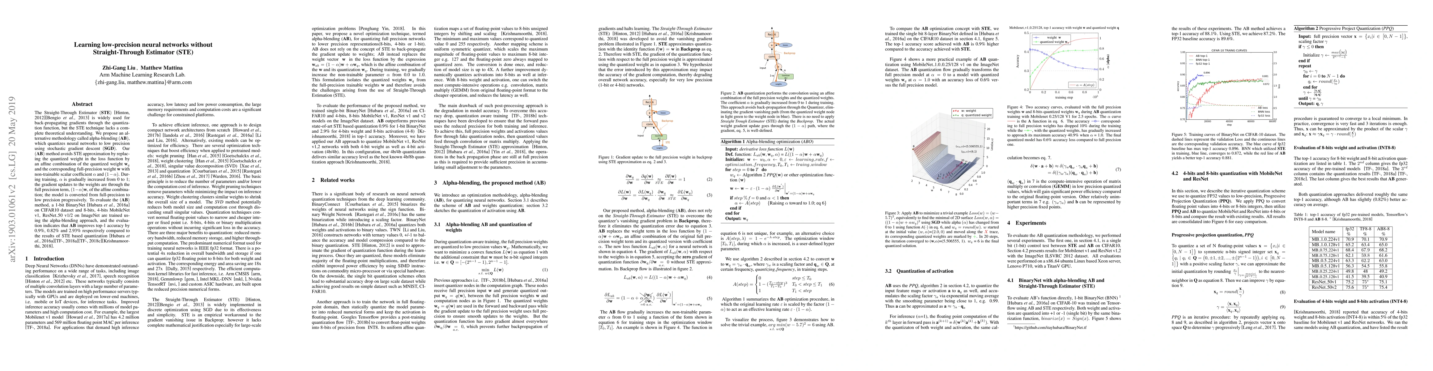 The Straight-Through Estimator (STE) is widely used for back-propagating gradients through the quantization function, but the STE technique lacks a complete theoretical understanding. We propose an alternative methodology called alpha-blending (AB), which quantizes neural networks to low-precision using stochastic gradient descent (SGD). Our method (AB) avoids STE approximation by replacing the quantized weight in the loss function by an affine combination of the quantized weight w_q and the corresponding full-precision weight w with non-trainable scalar coefficient $\alpha$ and $1-\alpha$. During training, $\alpha$ is gradually increased from 0 to 1; the gradient updates to the weights are through the full-precision term, $(1-\alpha)w$, of the affine combination; the model is converted from full-precision to low-precision progressively. To evaluate the method, a 1-bit BinaryNet on CIFAR10 dataset and 8-bits, 4-bits MobileNet v1, ResNet_50 v1/2 on ImageNet dataset are trained using the alpha-blending approach, and the evaluation indicates that AB improves top-1 accuracy by 0.9%, 0.82% and 2.93% respectively compared to the results of STE based quantization.