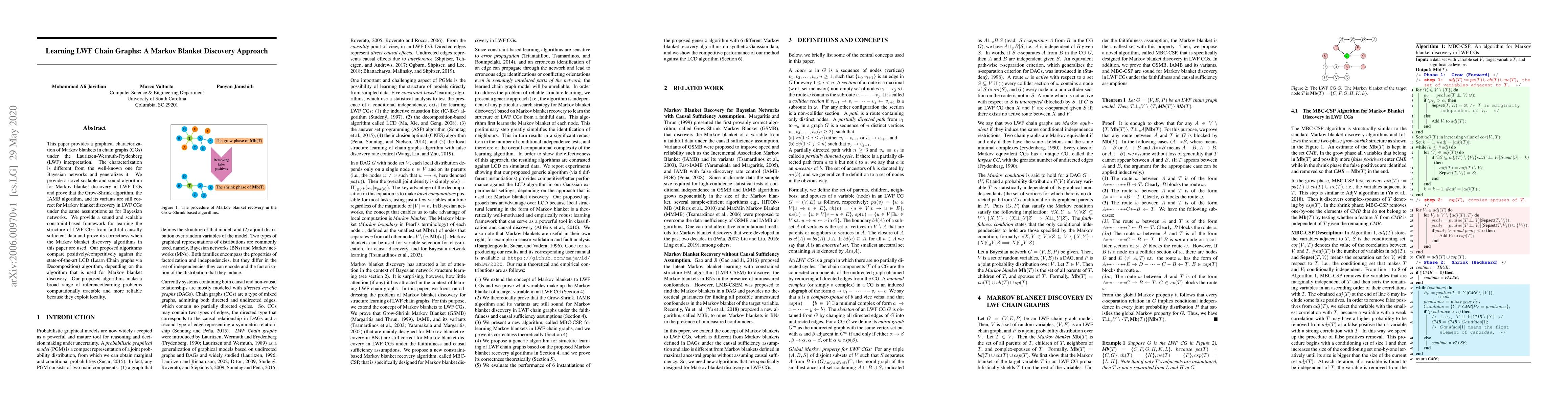 This paper introduces a novel scalable algorithm for discovering Markov blankets in Lauritzen-Wermuth-Frydenberg chain graphs (LWF CGs), proving the correctness of existing algorithms for this purpose and demonstrating competitive performance against state-of-the-art methods. The proposed framework enhances computational tractability and reliability for a range of inference problems.