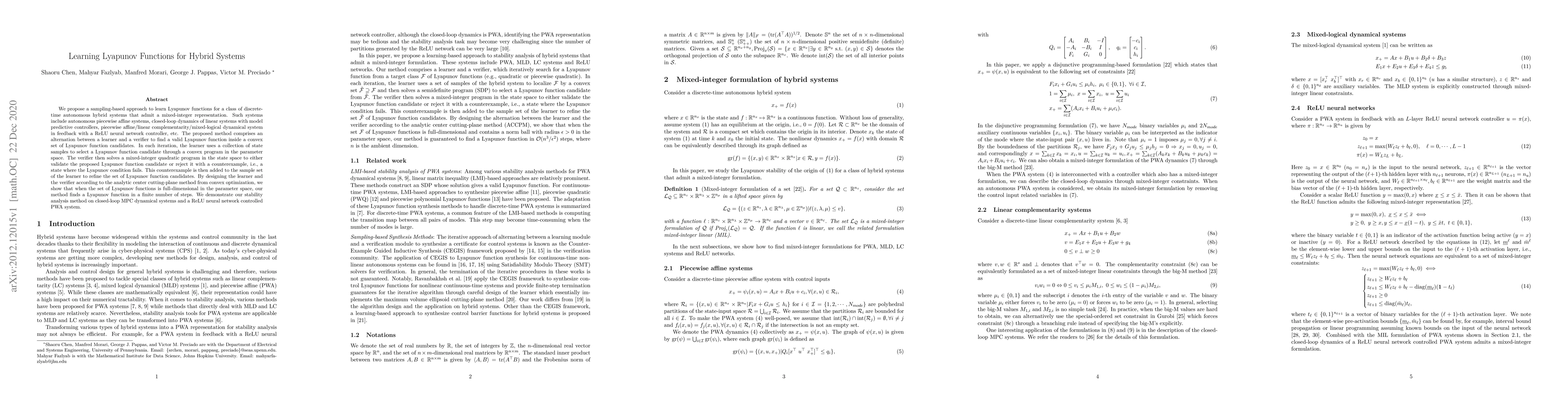 This paper presents a sampling-based method to learn Lyapunov functions for discrete-time autonomous hybrid systems through an alternation between a learner and a verifier, ensuring stability through finite steps. The approach effectively handles mixed-integer representations and is demonstrated on systems like MPC and neural network-controlled piecewise affine systems.