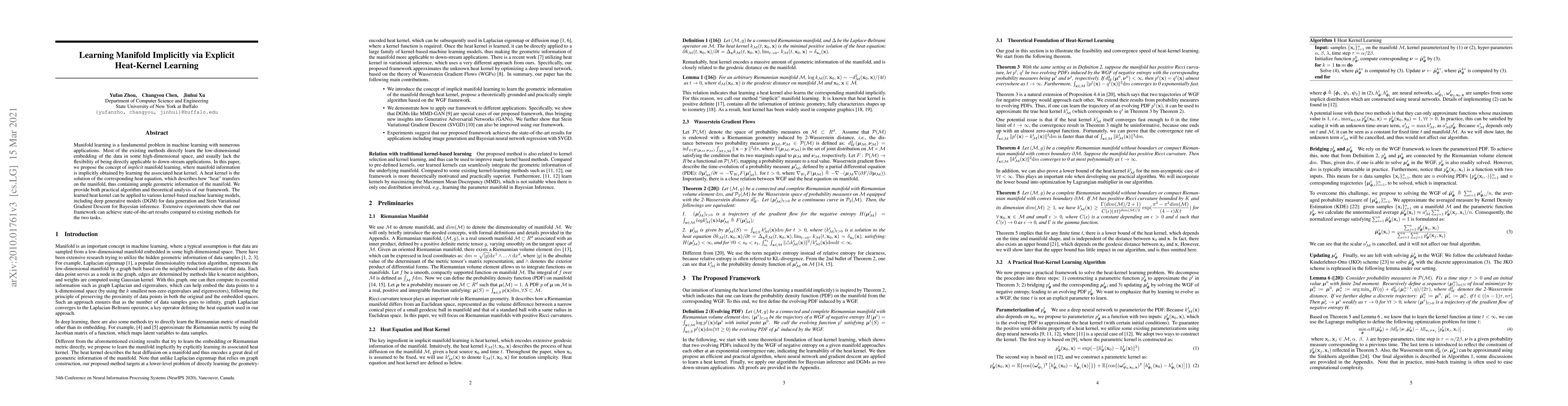 This paper proposes an implicit manifold learning method that learns the heat kernel to capture manifold information, offering flexibility for downstream applications. The method achieves state-of-the-art results in data generation and Bayesian inference, demonstrating the effectiveness of the learned heat kernel in various kernel-based machine learning models.