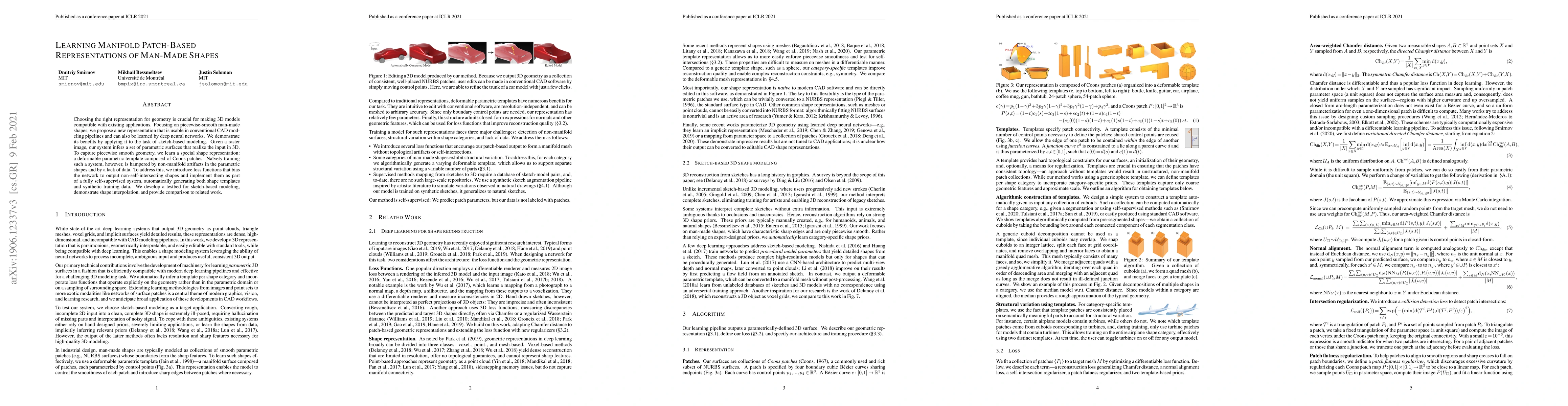 This paper proposes a novel representation for piecewise-smooth man-made shapes using deformable parametric templates composed of Coons patches, which are learned by deep neural networks to facilitate compatibility with CAD systems and sketch-based modeling. The authors introduce self-supervised loss functions to mitigate non-manifold artifacts and lack of data, demonstrating the effectiveness through shape interpolation and comparison to related approaches.