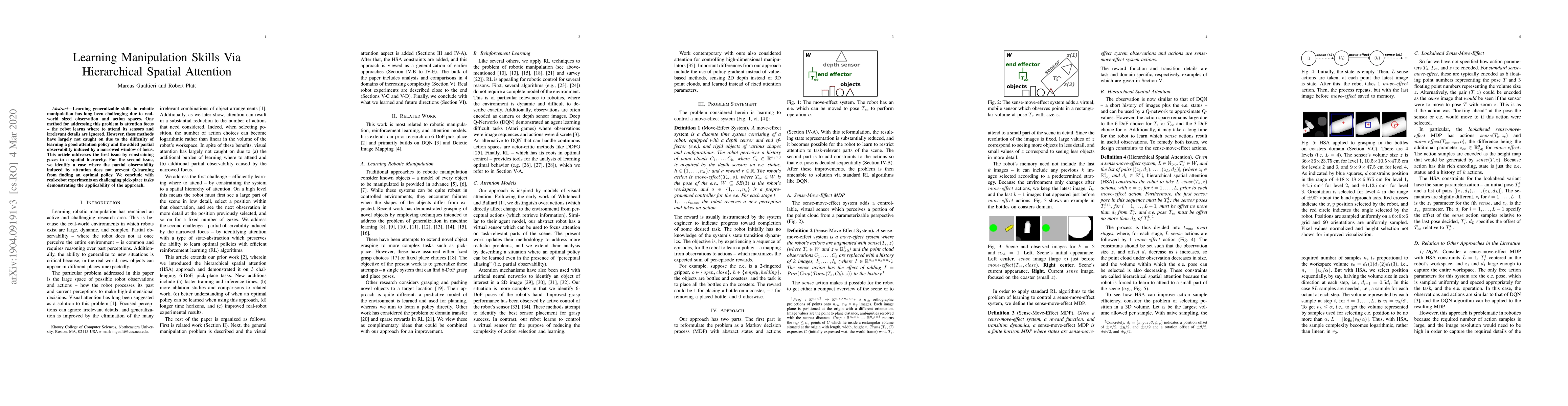 Learning generalizable skills in robotic manipulation has long been challenging due to real-world sized observation and action spaces. One method for addressing this problem is attention focus -- the robot learns where to attend its sensors and irrelevant details are ignored. However, these methods have largely not caught on due to the difficulty of learning a good attention policy and the added partial observability induced by a narrowed window of focus. This article addresses the first issue by constraining gazes to a spatial hierarchy. For the second issue, we identify a case where the partial observability induced by attention does not prevent Q-learning from finding an optimal policy. We conclude with real-robot experiments on challenging pick-place tasks demonstrating the applicability of the approach.