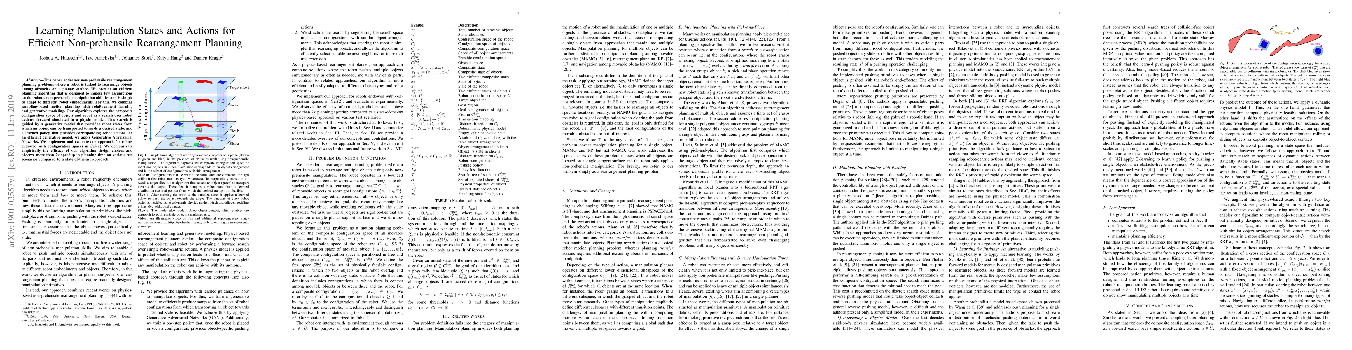 This paper presents an efficient non-prehensile rearrangement planning algorithm combining sampling-based motion planning with reinforcement learning and Generative Adversarial Networks, achieving over 2x speedup compared to state-of-the-art methods. The approach is adaptable to different robot embodiments and guided by a generative model for optimal robot actions.