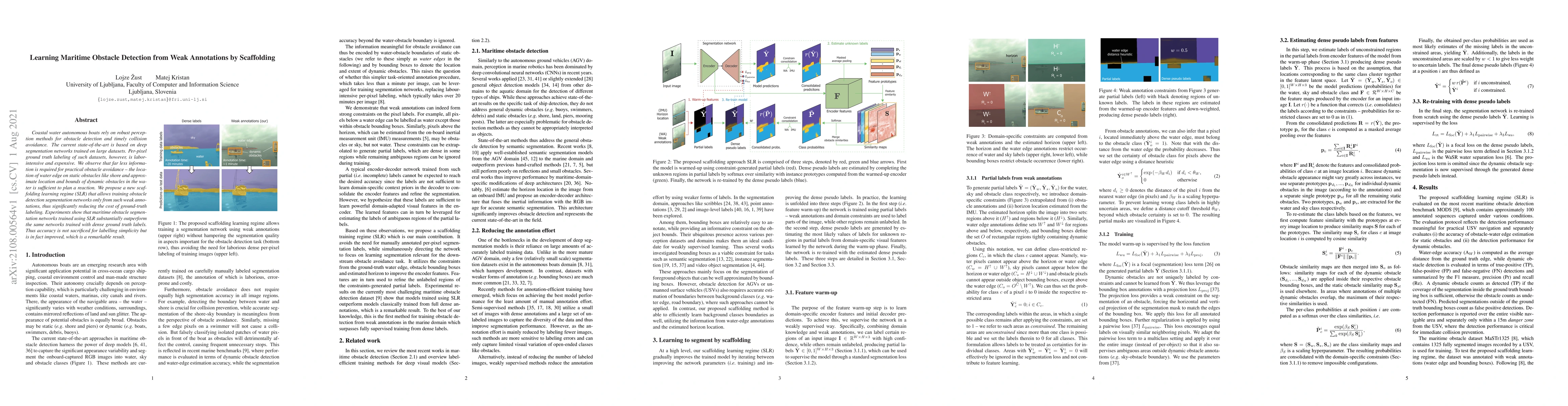 Coastal water autonomous boats rely on robust perception methods for obstacle detection and timely collision avoidance. The current state-of-the-art is based on deep segmentation networks trained on large datasets. Per-pixel ground truth labeling of such datasets, however, is labor-intensive and expensive. We observe that far less information is required for practical obstacle avoidance - the location of water edge on static obstacles like shore and approximate location and bounds of dynamic obstacles in the water is sufficient to plan a reaction. We propose a new scaffolding learning regime (SLR) that allows training obstacle detection segmentation networks only from such weak annotations, thus significantly reducing the cost of ground-truth labeling. Experiments show that maritime obstacle segmentation networks trained using SLR substantially outperform the same networks trained with dense ground truth labels. Thus accuracy is not sacrificed for labelling simplicity but is in fact improved, which is a remarkable result.