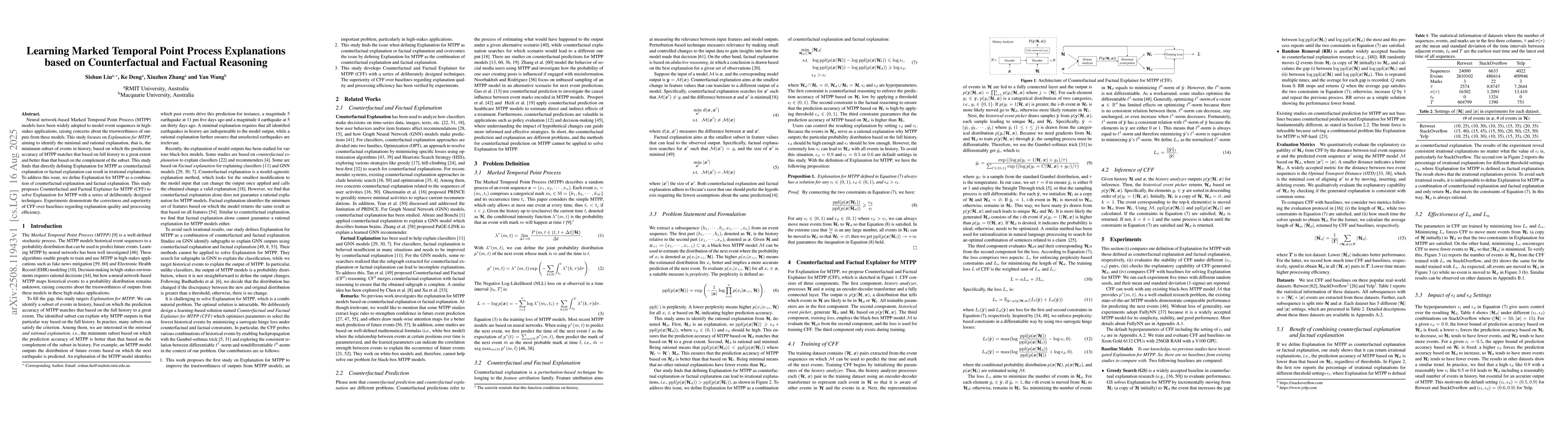 Neural network-based Marked Temporal Point Process (MTPP) models have been widely adopted to model event sequences in high-stakes applications, raising concerns about the trustworthiness of outputs from these models. This study focuses on Explanation for MTPP, aiming to identify the minimal and rational explanation, that is, the minimum subset of events in history, based on which the prediction accuracy of MTPP matches that based on full history to a great extent and better than that based on the complement of the subset. This study finds that directly defining Explanation for MTPP as counterfactual explanation or factual explanation can result in irrational explanations. To address this issue, we define Explanation for MTPP as a combination of counterfactual explanation and factual explanation. This study proposes Counterfactual and Factual Explainer for MTPP (CFF) to solve Explanation for MTPP with a series of deliberately designed techniques. Experiments demonstrate the correctness and superiority of CFF over baselines regarding explanation quality and processing efficiency.