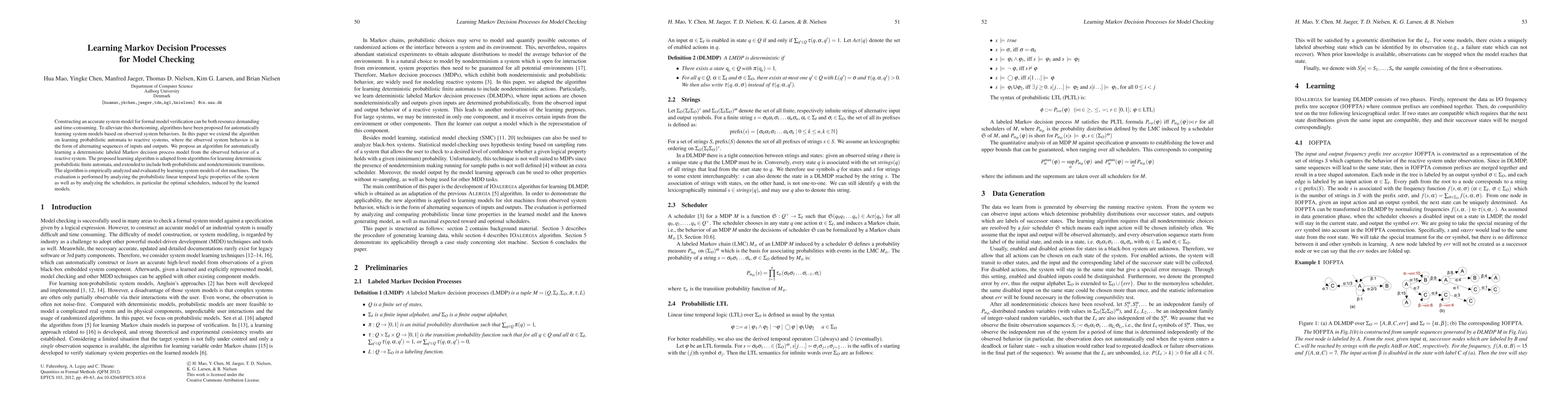 Constructing an accurate system model for formal model verification can be both resource demanding and time-consuming. To alleviate this shortcoming, algorithms have been proposed for automatically learning system models based on observed system behaviors. In this paper we extend the algorithm on learning probabilistic automata to reactive systems, where the observed system behavior is in the form of alternating sequences of inputs and outputs. We propose an algorithm for automatically learning a deterministic labeled Markov decision process model from the observed behavior of a reactive system. The proposed learning algorithm is adapted from algorithms for learning deterministic probabilistic finite automata, and extended to include both probabilistic and nondeterministic transitions. The algorithm is empirically analyzed and evaluated by learning system models of slot machines. The evaluation is performed by analyzing the probabilistic linear temporal logic properties of the system as well as by analyzing the schedulers, in particular the optimal schedulers, induced by the learned models.