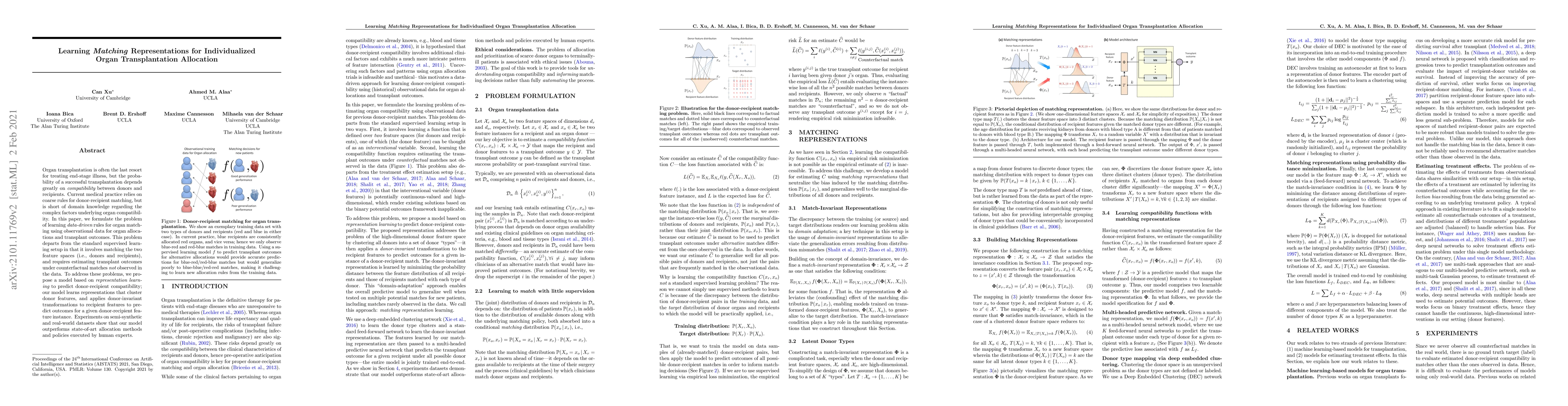 This paper proposes a representation learning model to improve organ transplantation allocation by learning data-driven rules for donor-recipient matching, outperforming existing methods and human experts. The model clusters donor features and transforms recipient features to predict compatibility for counterfactual matches.