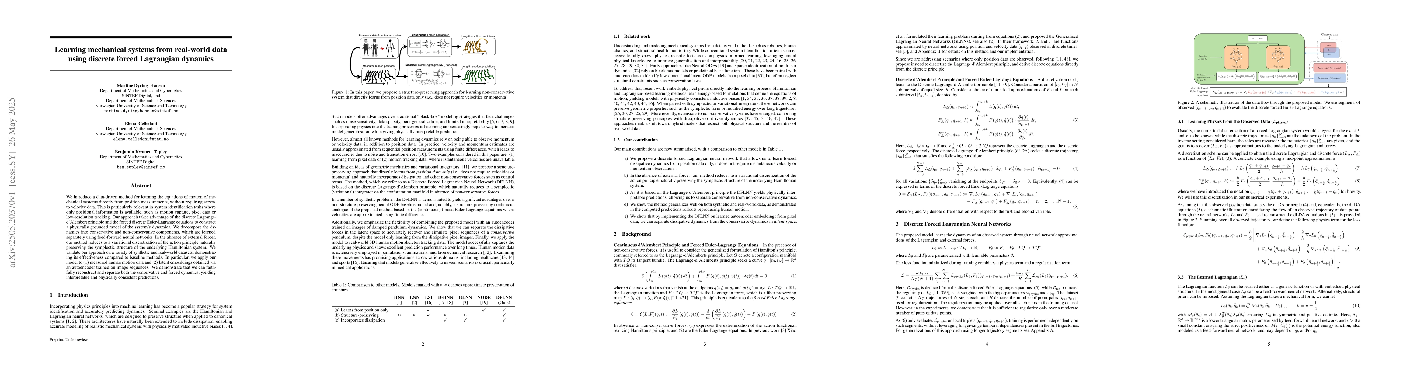 The paper presents a novel data-driven method for learning mechanical systems' equations of motion from position measurements, decomposing dynamics into conservative and non-conservative components using feed-forward neural networks.