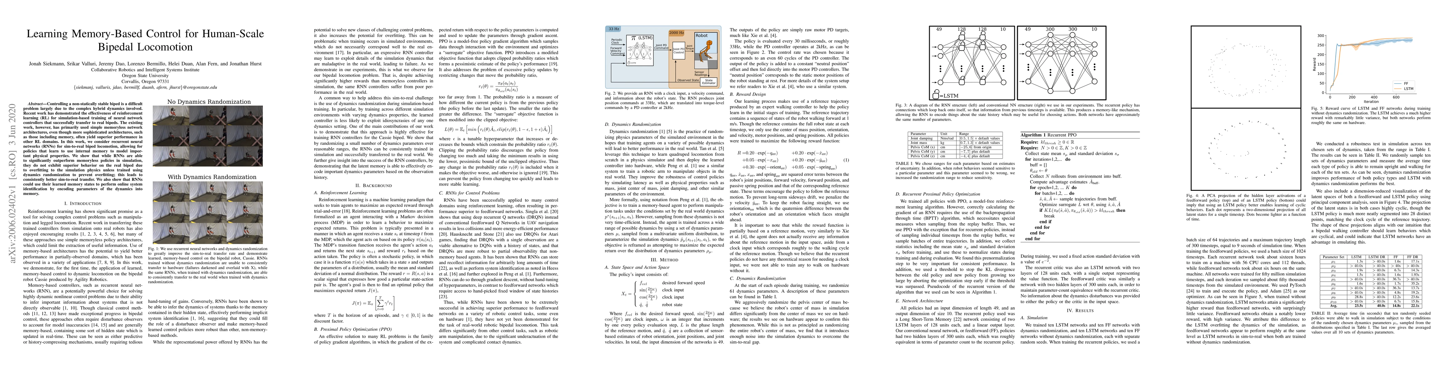 Controlling a non-statically stable biped is a difficult problem largely due to the complex hybrid dynamics involved. Recent work has demonstrated the effectiveness of reinforcement learning (RL) for simulation-based training of neural network controllers that successfully transfer to real bipeds. The existing work, however, has primarily used simple memoryless network architectures, even though more sophisticated architectures, such as those including memory, often yield superior performance in other RL domains. In this work, we consider recurrent neural networks (RNNs) for sim-to-real biped locomotion, allowing for policies that learn to use internal memory to model important physical properties. We show that while RNNs are able to significantly outperform memoryless policies in simulation, they do not exhibit superior behavior on the real biped due to overfitting to the simulation physics unless trained using dynamics randomization to prevent overfitting; this leads to consistently better sim-to-real transfer. We also show that RNNs could use their learned memory states to perform online system identification by encoding parameters of the dynamics into memory.