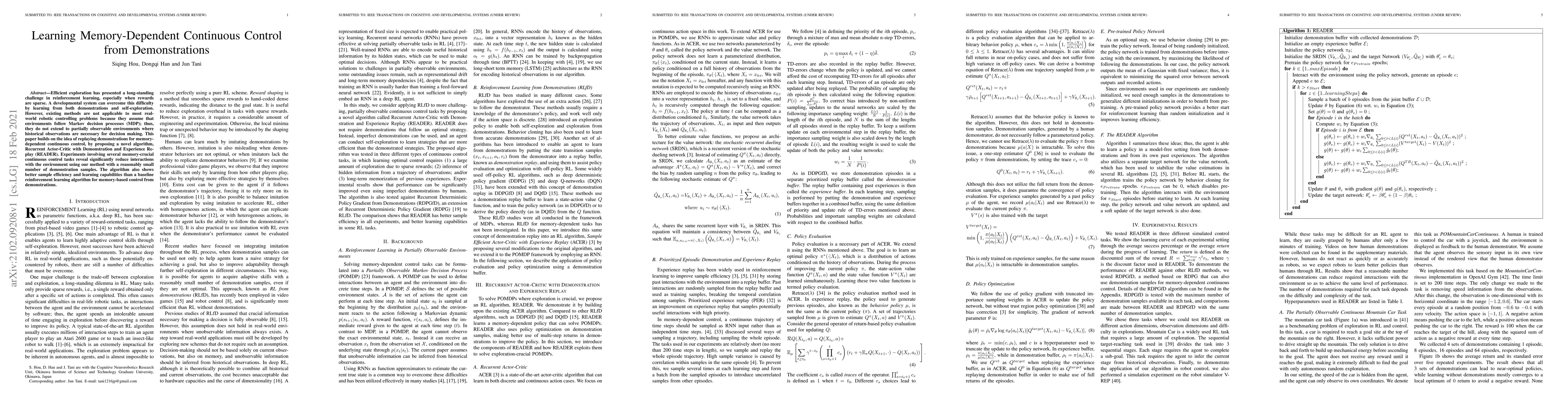 Efficient exploration has presented a long-standing challenge in reinforcement learning, especially when rewards are sparse. A developmental system can overcome this difficulty by learning from both demonstrations and self-exploration. However, existing methods are not applicable to most real-world robotic controlling problems because they assume that environments follow Markov decision processes (MDP); thus, they do not extend to partially observable environments where historical observations are necessary for decision making. This paper builds on the idea of replaying demonstrations for memory-dependent continuous control, by proposing a novel algorithm, Recurrent Actor-Critic with Demonstration and Experience Replay (READER). Experiments involving several memory-crucial continuous control tasks reveal significantly reduce interactions with the environment using our method with a reasonably small number of demonstration samples. The algorithm also shows better sample efficiency and learning capabilities than a baseline reinforcement learning algorithm for memory-based control from demonstrations.