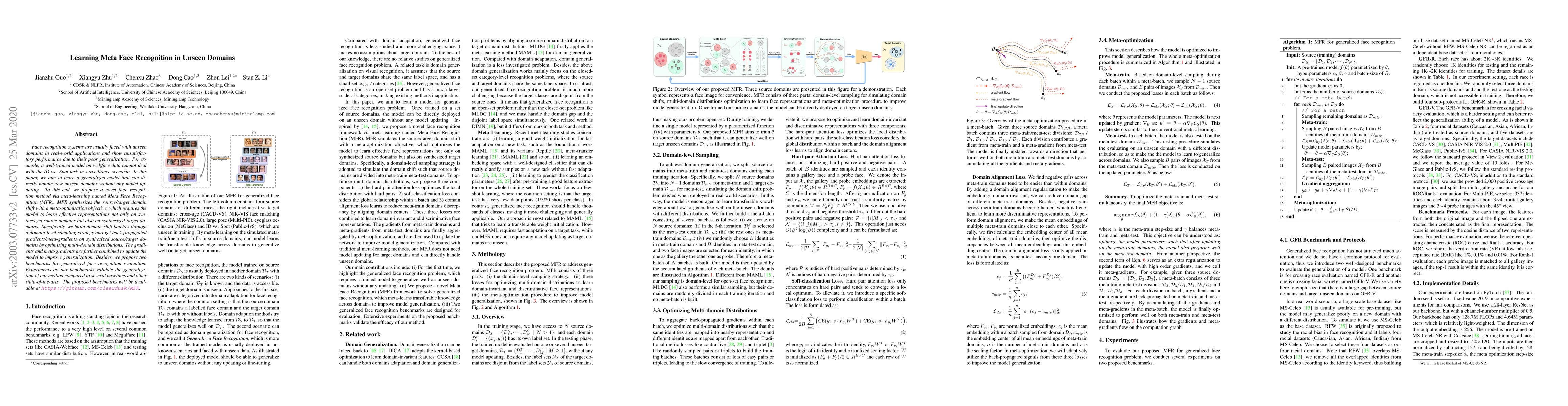 This paper proposes Meta Face Recognition (MFR), a meta-learning approach to enhance face recognition model generalization to unseen domains without requiring model updates. MFR synthesizes domain shifts and optimizes multi-domain distributions, creating new benchmarks for evaluating generalized face recognition.