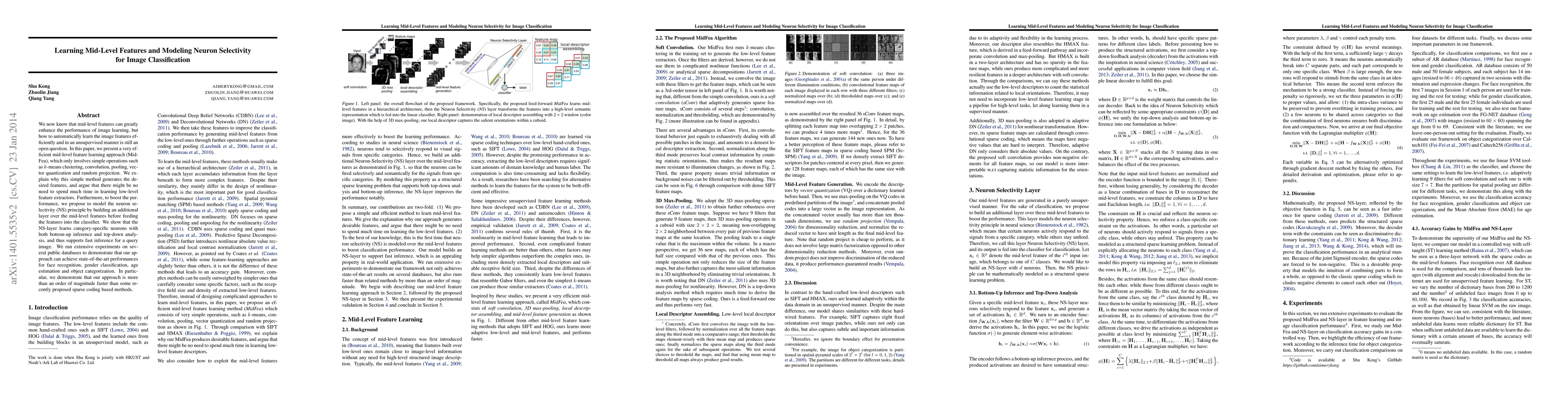 This paper introduces an efficient mid-level feature learning method (MidFea) using simple operations like $k$-means clustering and convolution, and proposes a neuron selectivity layer to enhance classification performance. Experiments show it achieves state-of-the-art results for various image classification tasks while being significantly faster than sparse coding methods.