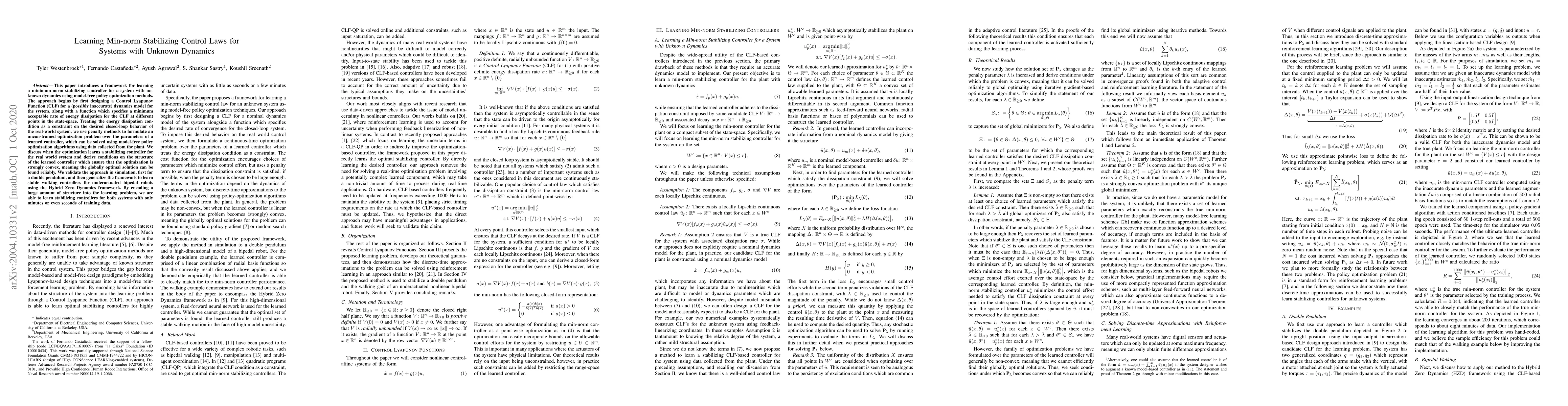 This paper develops a framework for learning minimum-norm stabilizing control laws for systems with unknown dynamics using model-free policy optimization. It leverages a Control Lyapunov Function and penalty methods to ensure the learned controller stabilizes the system, validated through simulations on a double pendulum and bipedal robots.