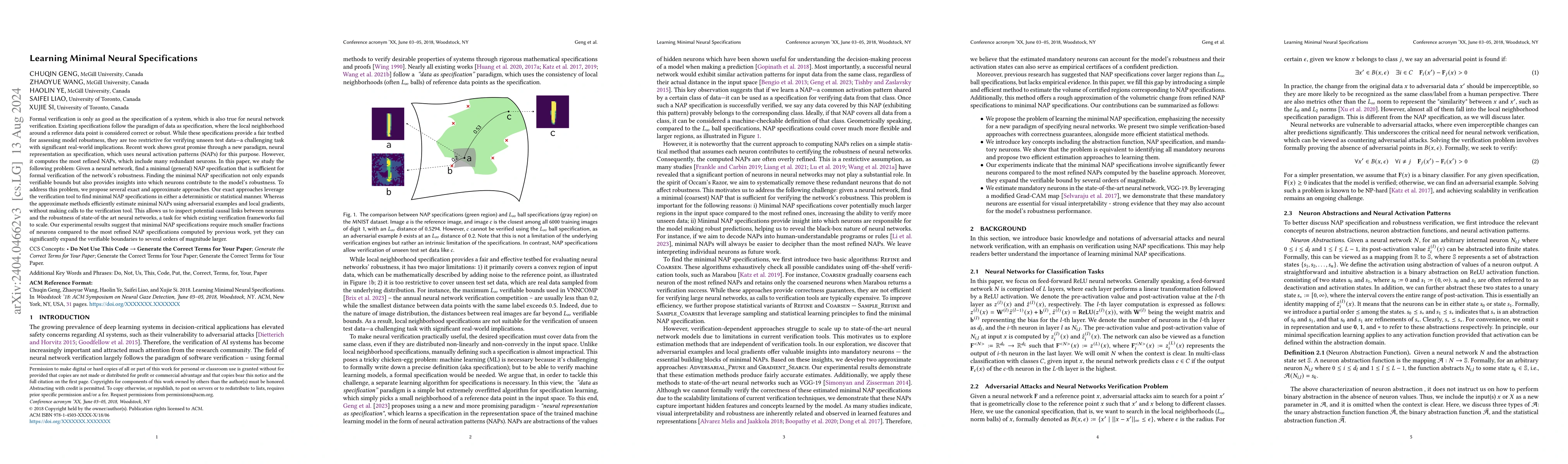 Specifications play a crucial role in neural network verification. They define the precise input regions we aim to verify, typically represented as L-infinity norm balls. While recent research suggests using neural activation patterns (NAPs) as specifications for verifying unseen test set data, it focuses on computing the most refined NAPs, often limited to very small regions in the input space. In this paper, we study the following problem: Given a neural network, find a minimal (coarsest) NAP that is sufficient for formal verification of the network's robustness. Finding the minimal NAP specification not only expands verifiable bounds but also provides insights into which neurons contribute to the model's robustness. To address this problem, we propose several exact and approximate approaches. Our exact approaches leverage the verification tool to find minimal NAP specifications in either a deterministic or statistical manner. Whereas the approximate methods efficiently estimate minimal NAPs using adversarial examples and local gradients, without making calls to the verification tool. This allows us to inspect potential causal links between neurons and the robustness of state-of-the-art neural networks, a task for which existing verification frameworks fail to scale. Our experimental results suggest that minimal NAP specifications require much smaller fractions of neurons compared to the most refined NAP specifications, yet they can significantly expand the verifiable boundaries to several orders of magnitude larger.