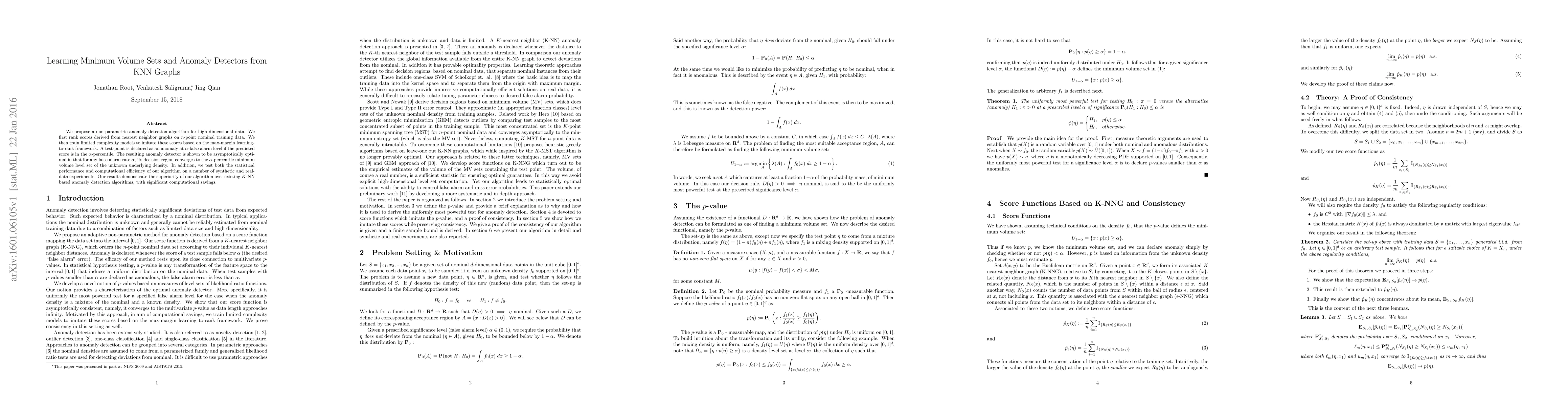 We propose a non-parametric anomaly detection algorithm for high dimensional data. We first rank scores derived from nearest neighbor graphs on $n$-point nominal training data. We then train limited complexity models to imitate these scores based on the max-margin learning-to-rank framework. A test-point is declared as an anomaly at $\alpha$-false alarm level if the predicted score is in the $\alpha$-percentile. The resulting anomaly detector is shown to be asymptotically optimal in that for any false alarm rate $\alpha$, its decision region converges to the $\alpha$-percentile minimum volume level set of the unknown underlying density. In addition, we test both the statistical performance and computational efficiency of our algorithm on a number of synthetic and real-data experiments. Our results demonstrate the superiority of our algorithm over existing $K$-NN based anomaly detection algorithms, with significant computational savings.