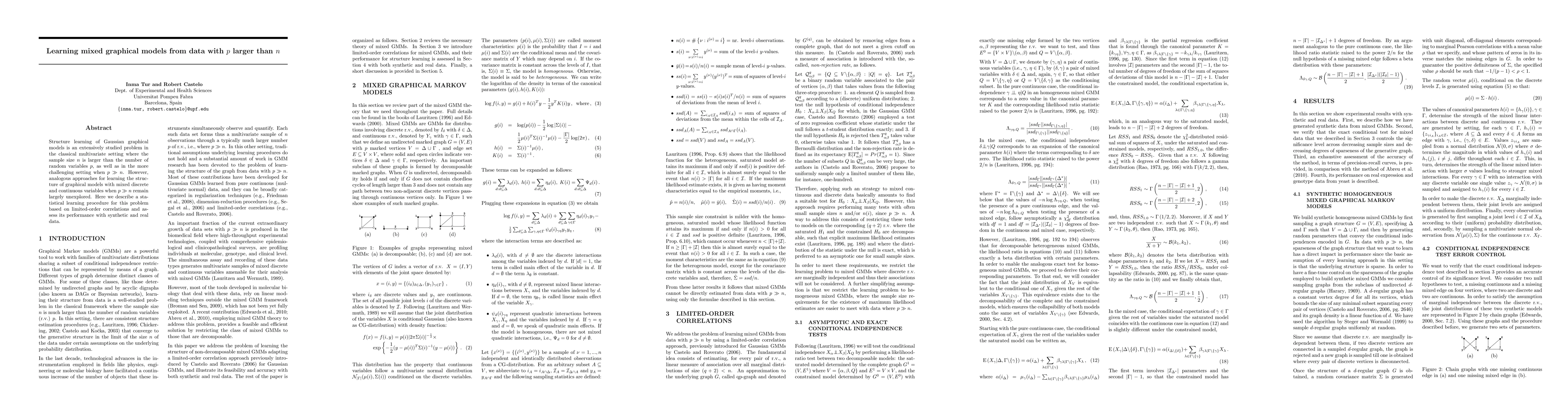 Structure learning of Gaussian graphical models is an extensively studied problem in the classical multivariate setting where the sample size n is larger than the number of random variables p, as well as in the more challenging setting when p>>n. However, analogous approaches for learning the structure of graphical models with mixed discrete and continuous variables when p>>n remain largely unexplored. Here we describe a statistical learning procedure for this problem based on limited-order correlations and assess its performance with synthetic and real data.