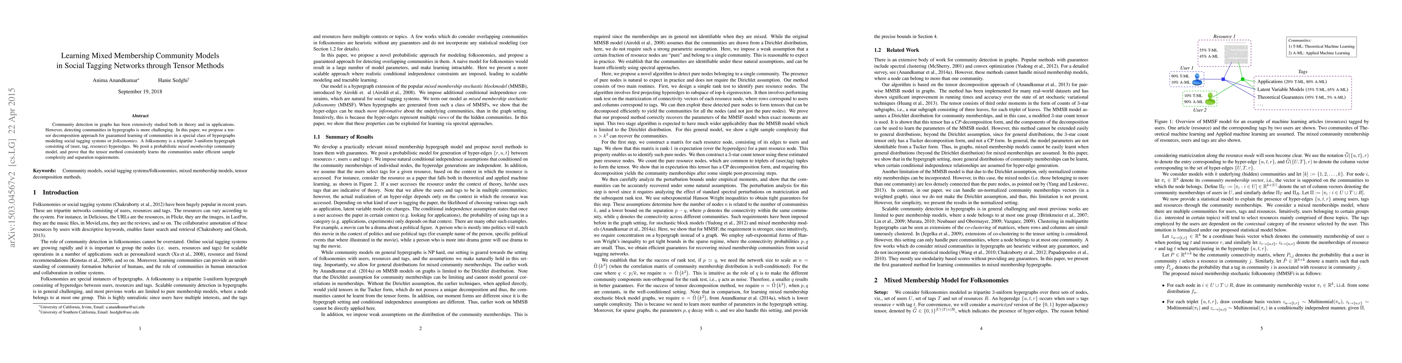 This paper proposes a tensor decomposition method for learning mixed membership communities in social tagging networks modeled as tripartite hypergraphs. The approach guarantees community detection under efficient sample complexity and separation requirements.