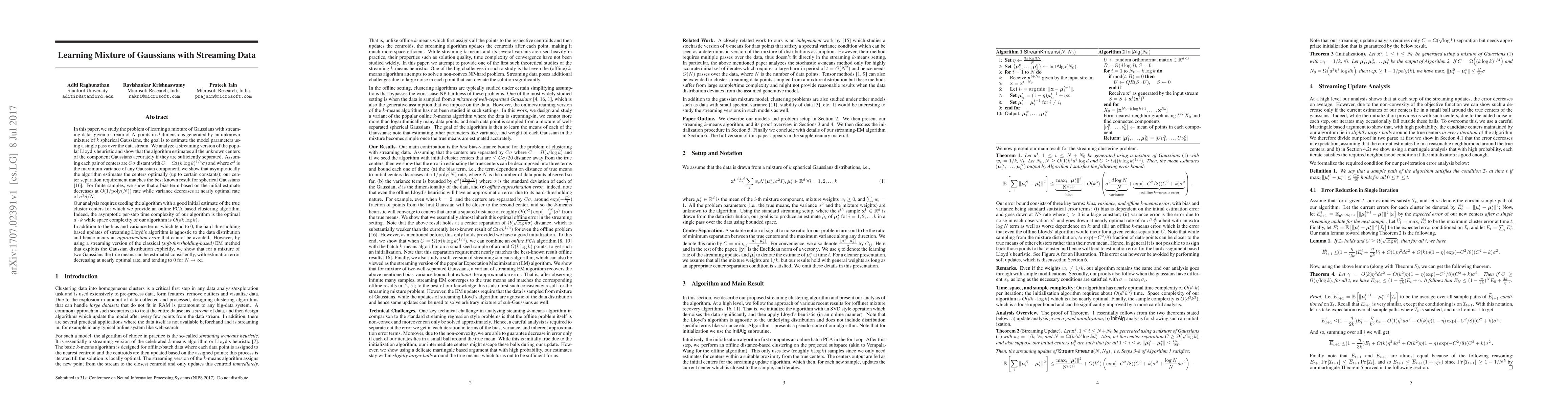 This paper proposes a streaming algorithm for learning a mixture of spherical Gaussians from a data stream, analyzing its performance under separation conditions. It demonstrates optimal estimation of Gaussian centers and consistent mean estimation for two Gaussians, while addressing bias and variance reduction.