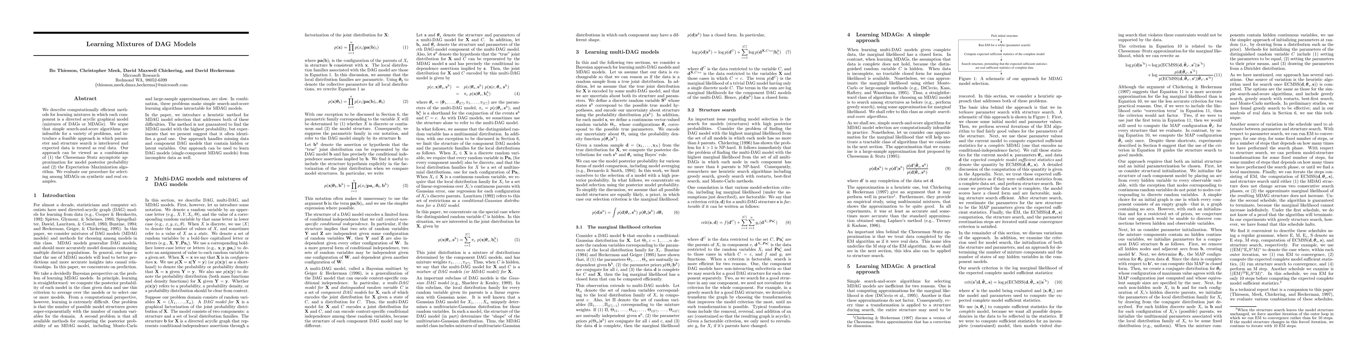 We describe computationally efficient methods for learning mixtures in which each component is a directed acyclic graphical model (mixtures of DAGs or MDAGs). We argue that simple search-and-score algorithms are infeasible for a variety of problems, and introduce a feasible approach in which parameter and structure search is interleaved and expected data is treated as real data. Our approach can be viewed as a combination of (1) the Cheeseman--Stutz asymptotic approximation for model posterior probability and (2) the Expectation--Maximization algorithm. We evaluate our procedure for selecting among MDAGs on synthetic and real examples.