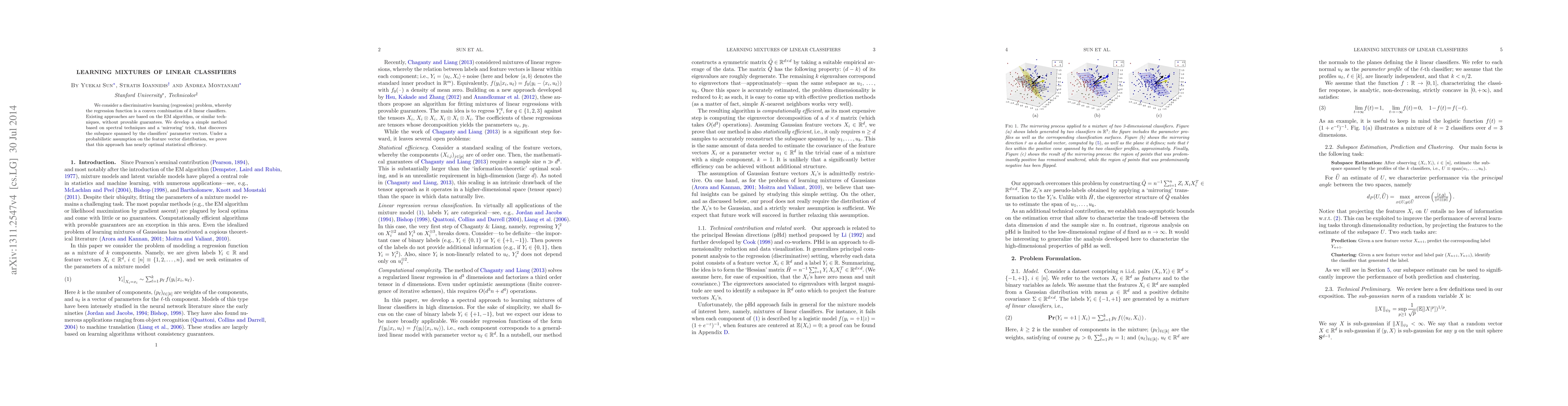 This paper proposes a novel method for learning mixtures of linear classifiers using spectral techniques and a mirroring trick, which identifies the subspace of the classifiers. It demonstrates nearly optimal statistical efficiency under a probabilistic assumption on the feature vector distribution, offering a significant improvement over existing EM-based methods.