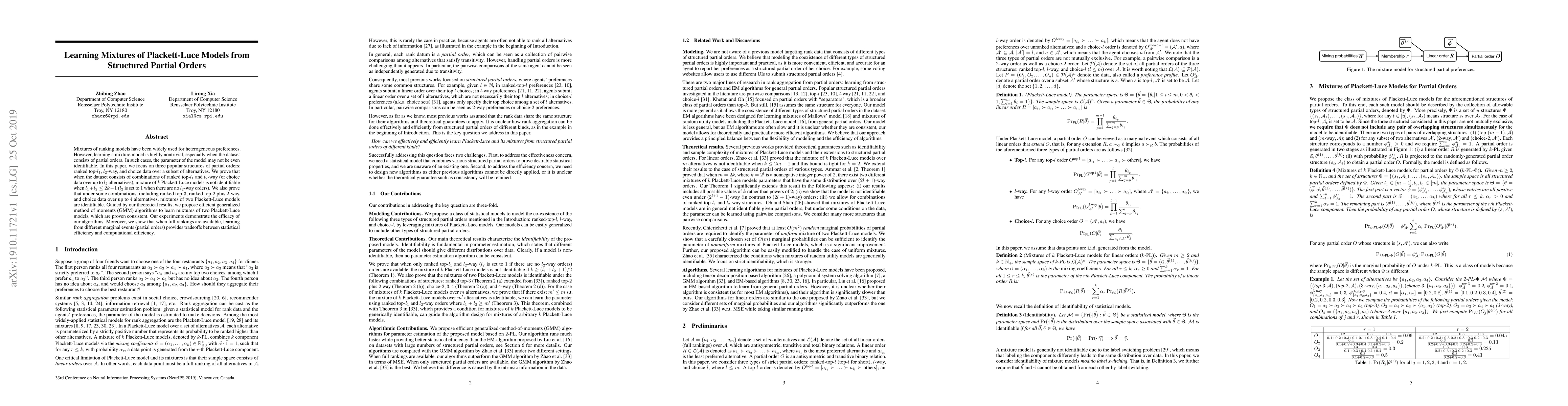 This paper investigates the identifiability of mixtures of Plackett-Luce models from structured partial orders, proving non-identifiability under certain conditions and identifying scenarios where mixtures of two models are identifiable. It proposes efficient GMM algorithms for learning these mixtures, demonstrating their effectiveness and exploring trade-offs between statistical and computational efficiency.