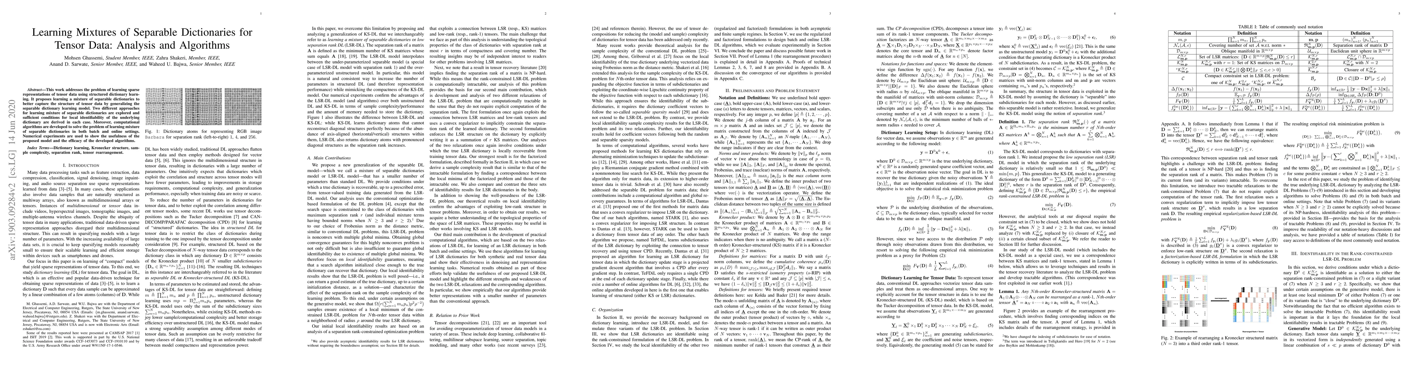This paper proposes learning mixtures of separable dictionaries to capture the structure of tensor data through structured dictionary learning. It develops algorithms for both batch and online settings, and demonstrates their effectiveness through numerical experiments.