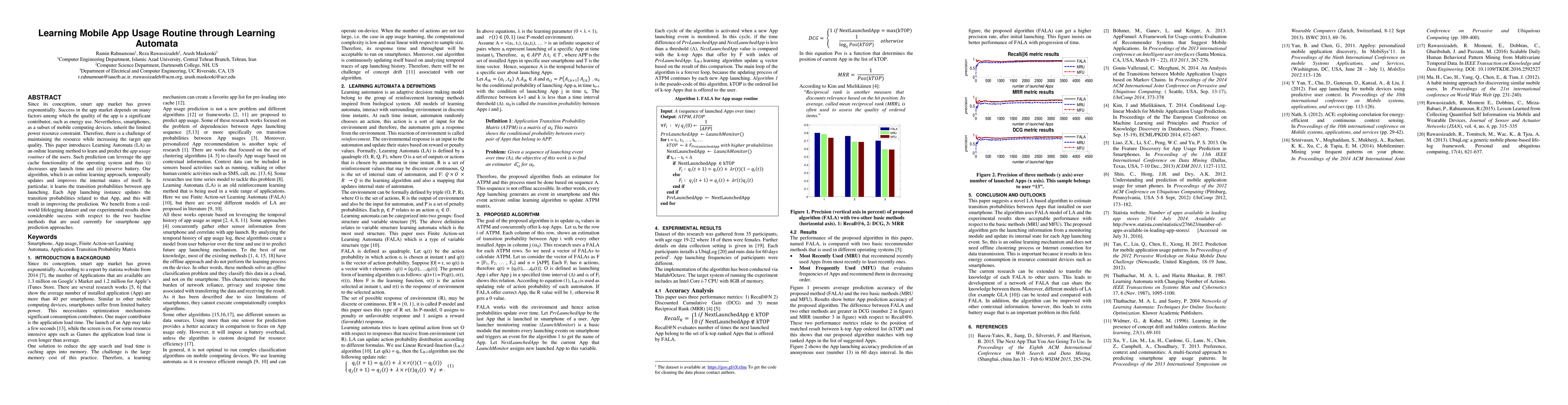 This paper proposes using Learning Automata to predict mobile app usage routines, aiming to reduce app launch times and conserve battery life. The algorithm updates transition probabilities based on user behavior, showing significant improvement over existing smartphone app prediction methods.
