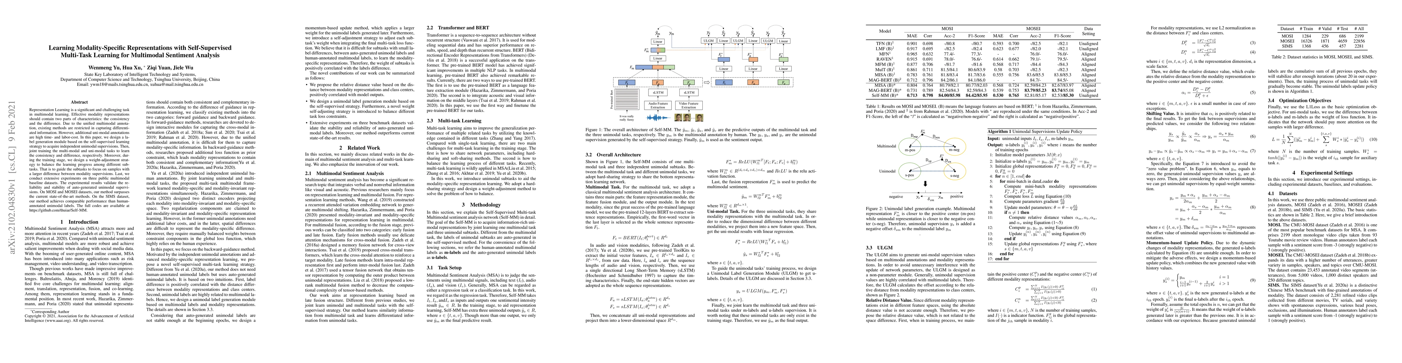 This paper proposes a self-supervised multi-task learning approach to learn modality-specific representations for multimodal sentiment analysis, achieving state-of-the-art performance on three public datasets.