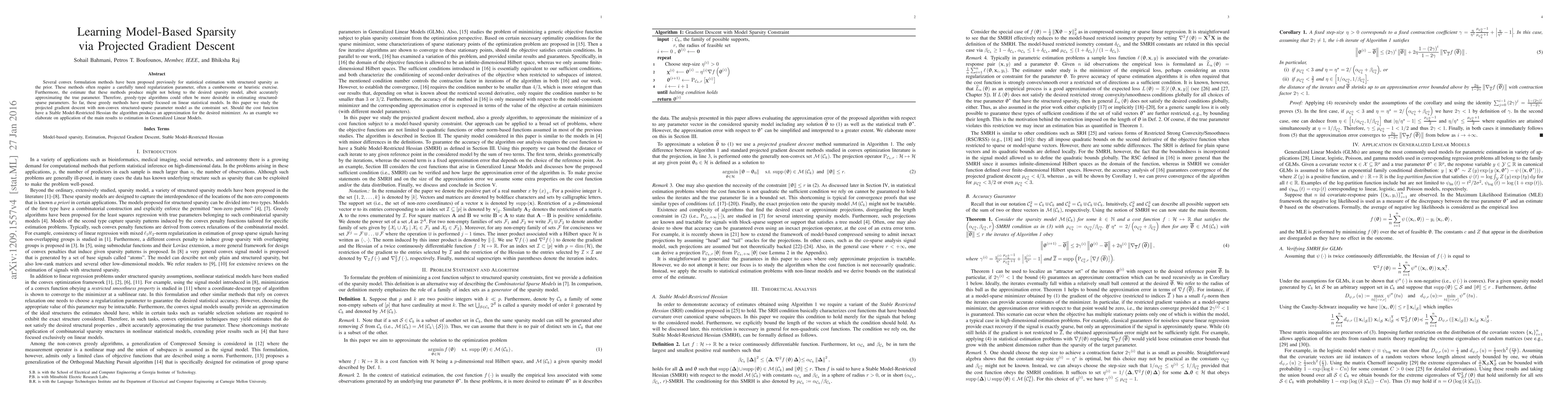 This paper proposes a projected gradient descent method for estimating structured-sparse parameters in statistical models, addressing the limitations of convex methods that require careful tuning of regularization parameters. The method aims to produce estimates that adhere to the desired sparsity model, with applications demonstrated in Generalized Linear Models.