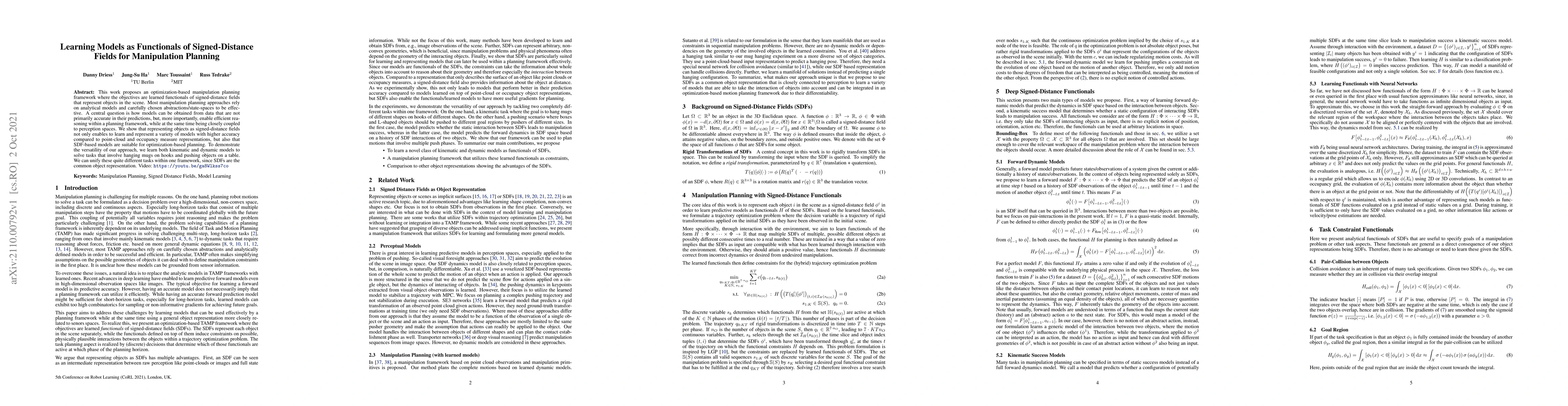 This paper introduces an optimization-based manipulation planning framework using learned functionals of signed-distance fields (SDFs) for object representation, demonstrating higher accuracy and efficient planning compared to traditional methods. The approach unifies diverse tasks within a single framework by leveraging SDFs as a common object representation.