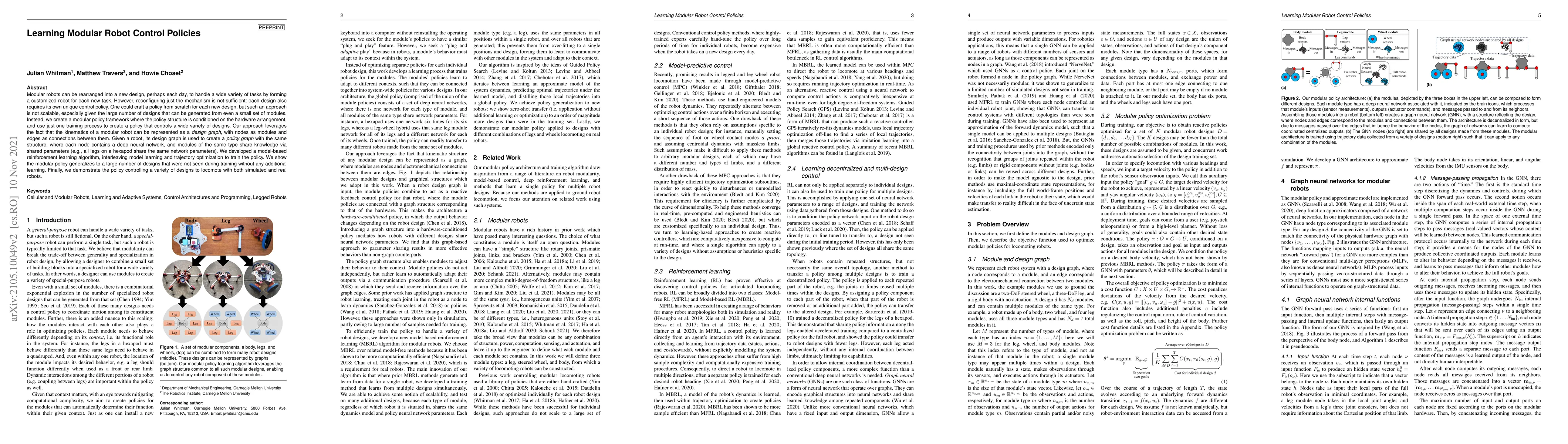 This paper proposes a modular policy framework for controlling modular robots, where a single policy is trained to handle a wide range of designs by leveraging shared parameters among similar modules. The approach uses a model-based reinforcement learning algorithm to generalize control policies to unseen designs without additional training.