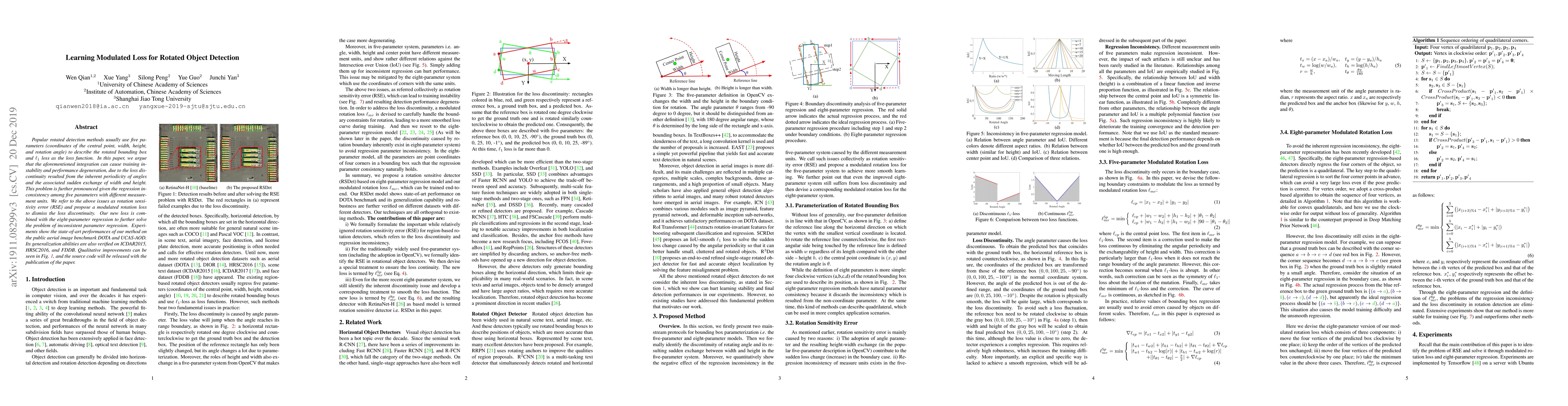 Popular rotated detection methods usually use five parameters (coordinates of the central point, width, height, and rotation angle) to describe the rotated bounding box and l1-loss as the loss function. In this paper, we argue that the aforementioned integration can cause training instability and performance degeneration, due to the loss discontinuity resulted from the inherent periodicity of angles and the associated sudden exchange of width and height. This problem is further pronounced given the regression inconsistency among five parameters with different measurement units. We refer to the above issues as rotation sensitivity error (RSE) and propose a modulated rotation loss to dismiss the loss discontinuity. Our new loss is combined with the eight-parameter regression to further solve the problem of inconsistent parameter regression. Experiments show the state-of-art performances of our method on the public aerial image benchmark DOTA and UCAS-AOD. Its generalization abilities are also verified on ICDAR2015, HRSC2016, and FDDB. Qualitative improvements can be seen in Fig 1, and the source code will be released with the publication of the paper.