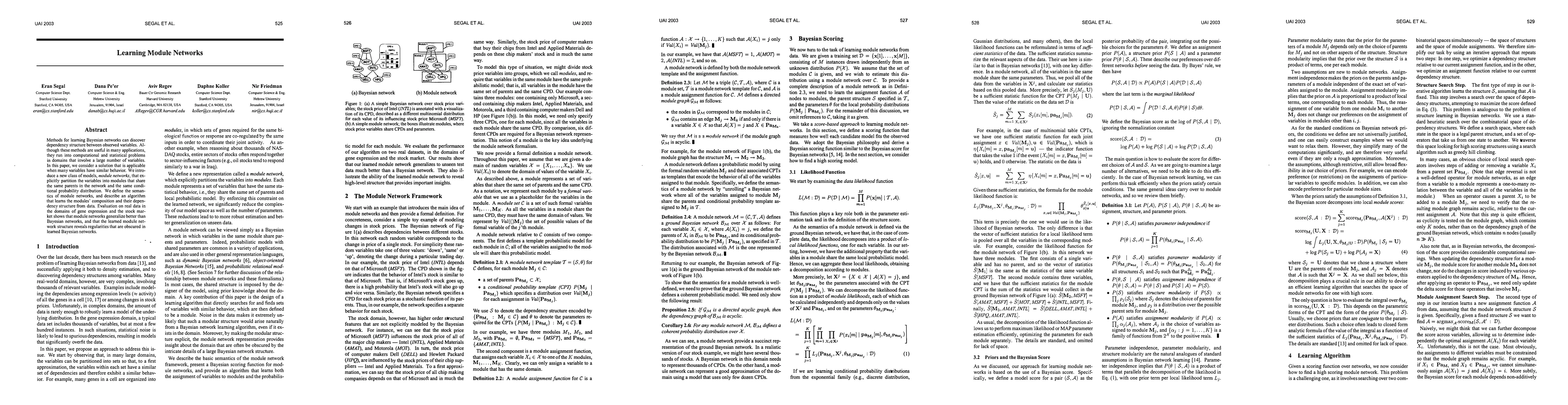 This paper introduces module networks, a new class of models that represent groups of variables sharing the same parents and conditional distributions, to efficiently learn Bayesian network structures in domains with many similar variables. The proposed algorithm learns both module partitioning and dependency structures, demonstrating better generalization and revealing hidden regularities compared to traditional Bayesian networks.