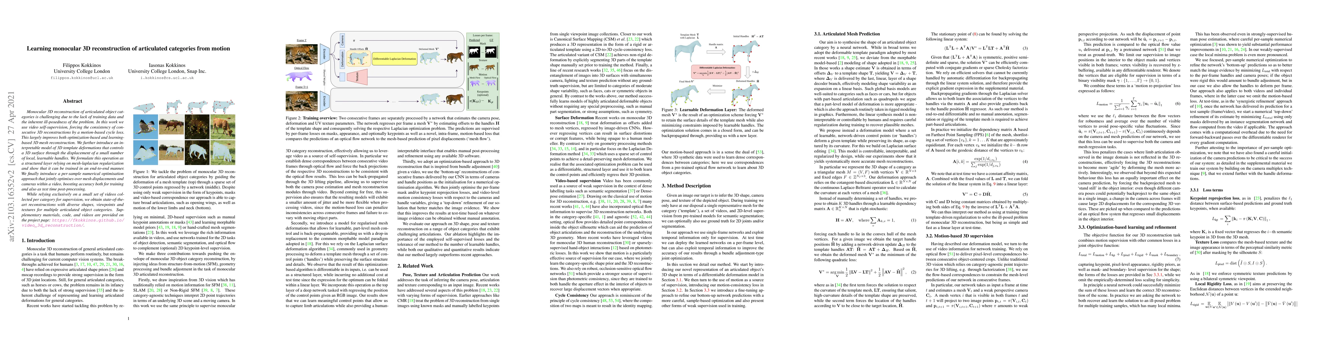 This paper presents a method for monocular 3D reconstruction of articulated objects using video self-supervision and a motion-based cycle loss, achieving state-of-the-art results with minimal supervision. It introduces a structured layer for 3D template deformations and an end-to-end training approach, along with a post-processing optimization technique to enhance accuracy.
