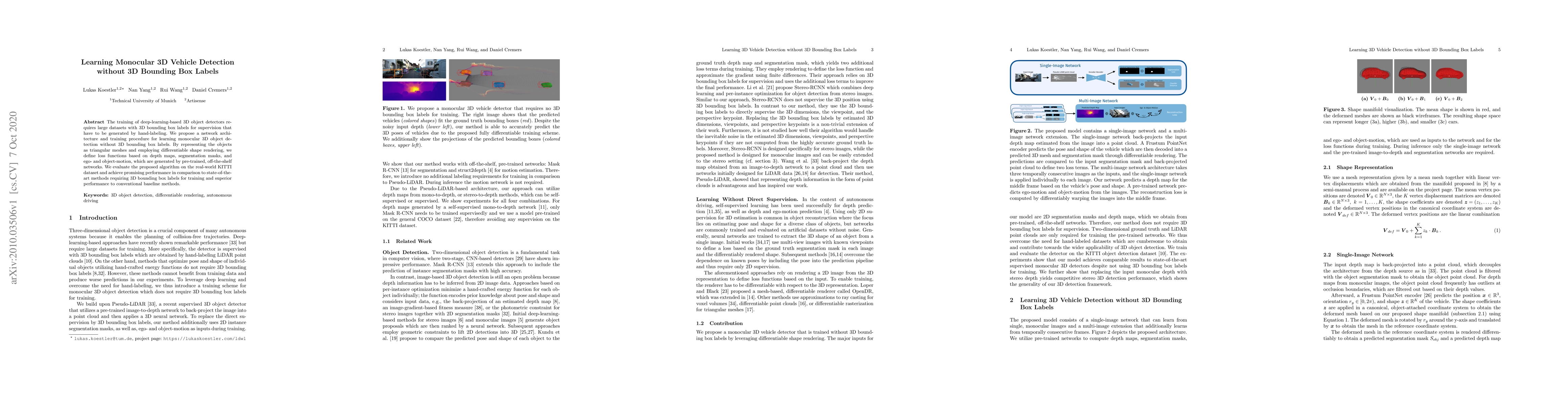 The training of deep-learning-based 3D object detectors requires large datasets with 3D bounding box labels for supervision that have to be generated by hand-labeling. We propose a network architecture and training procedure for learning monocular 3D object detection without 3D bounding box labels. By representing the objects as triangular meshes and employing differentiable shape rendering, we define loss functions based on depth maps, segmentation masks, and ego- and object-motion, which are generated by pre-trained, off-the-shelf networks. We evaluate the proposed algorithm on the real-world KITTI dataset and achieve promising performance in comparison to state-of-the-art methods requiring 3D bounding box labels for training and superior performance to conventional baseline methods.