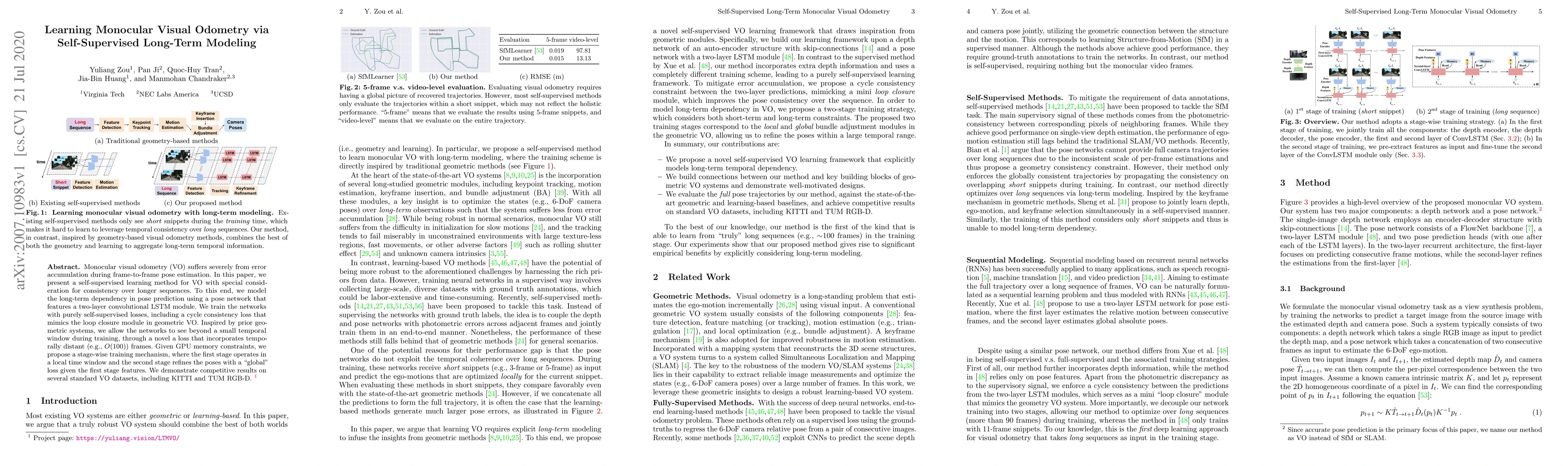 This paper presents a self-supervised learning approach for monocular visual odometry that addresses error accumulation through long-term dependency modeling using a convolutional LSTM network, and achieves competitive results on standard datasets like KITTI and TUM RGB-D. The method employs a stage-wise training mechanism to handle GPU memory constraints and incorporates distant temporal frames for improved pose prediction consistency.