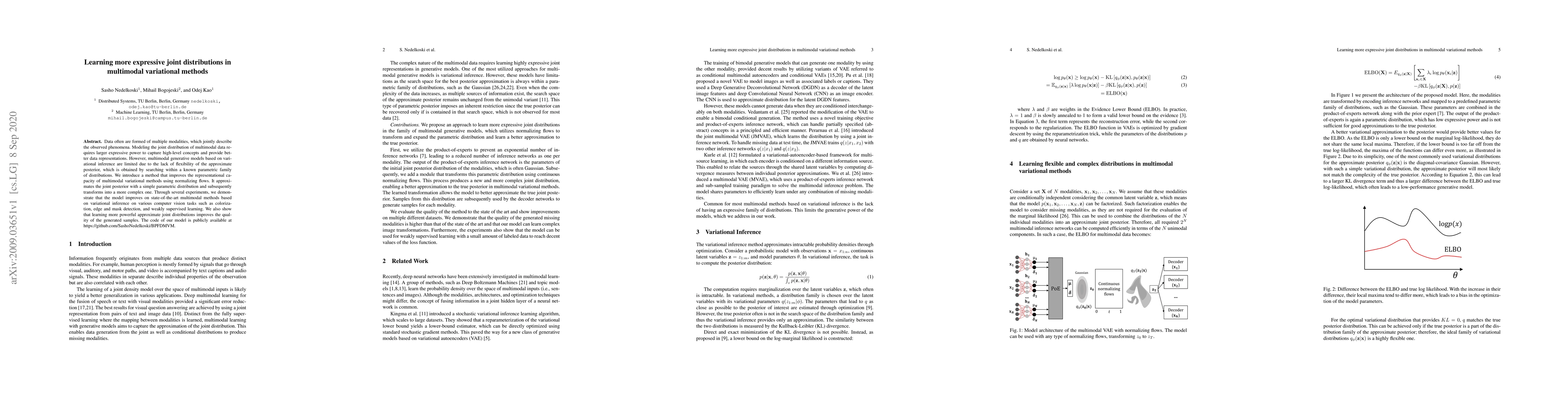 Data often are formed of multiple modalities, which jointly describe the observed phenomena. Modeling the joint distribution of multimodal data requires larger expressive power to capture high-level concepts and provide better data representations. However, multimodal generative models based on variational inference are limited due to the lack of flexibility of the approximate posterior, which is obtained by searching within a known parametric family of distributions. We introduce a method that improves the representational capacity of multimodal variational methods using normalizing flows. It approximates the joint posterior with a simple parametric distribution and subsequently transforms into a more complex one. Through several experiments, we demonstrate that the model improves on state-of-the-art multimodal methods based on variational inference on various computer vision tasks such as colorization, edge and mask detection, and weakly supervised learning. We also show that learning more powerful approximate joint distributions improves the quality of the generated samples. The code of our model is publicly available at https://github.com/SashoNedelkoski/BPFDMVM.