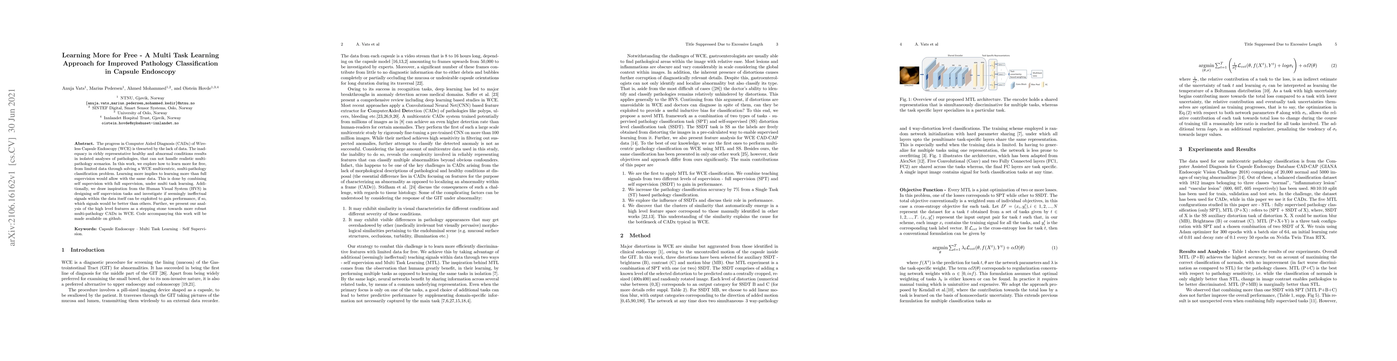 The progress in Computer Aided Diagnosis (CADx) of Wireless Capsule Endoscopy (WCE) is thwarted by the lack of data. The inadequacy in richly representative healthy and abnormal conditions results in isolated analyses of pathologies, that can not handle realistic multi-pathology scenarios. In this work, we explore how to learn more for free, from limited data through solving a WCE multicentric, multi-pathology classification problem. Learning more implies to learning more than full supervision would allow with the same data. This is done by combining self supervision with full supervision, under multi task learning. Additionally, we draw inspiration from the Human Visual System (HVS) in designing self supervision tasks and investigate if seemingly ineffectual signals within the data itself can be exploited to gain performance, if so, which signals would be better than others. Further, we present our analysis of the high level features as a stepping stone towards more robust multi-pathology CADx in WCE.