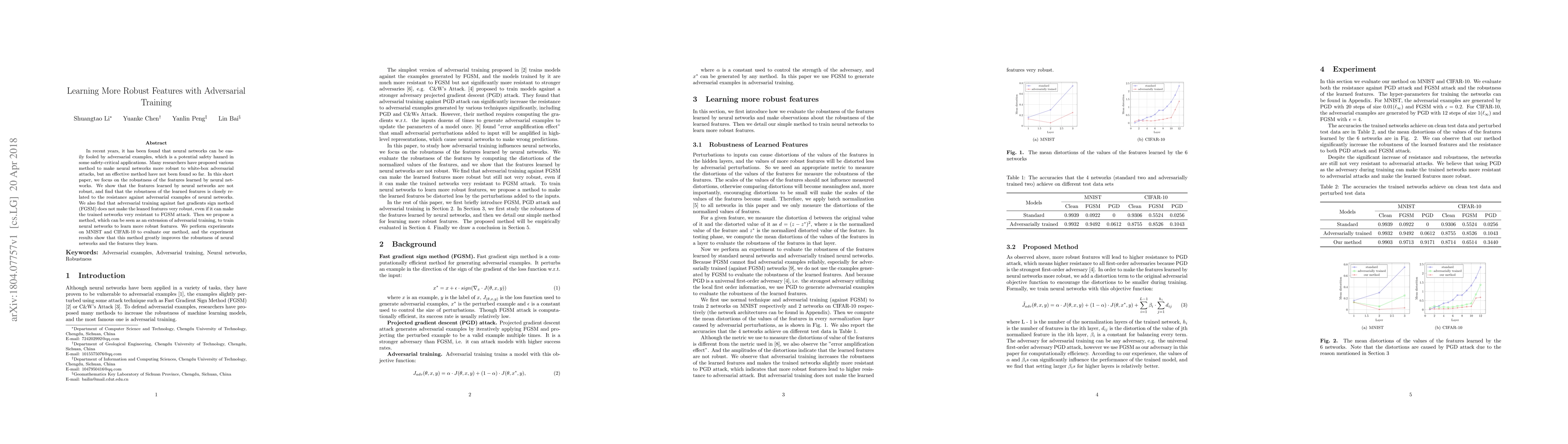 In recent years, it has been found that neural networks can be easily fooled by adversarial examples, which is a potential safety hazard in some safety-critical applications. Many researchers have proposed various method to make neural networks more robust to white-box adversarial attacks, but an effective method have not been found so far. In this short paper, we focus on the robustness of the features learned by neural networks. We show that the features learned by neural networks are not robust, and find that the robustness of the learned features is closely related to the resistance against adversarial examples of neural networks. We also find that adversarial training against fast gradients sign method (FGSM) does not make the leaned features very robust, even if it can make the trained networks very resistant to FGSM attack. Then we propose a method, which can be seen as an extension of adversarial training, to train neural networks to learn more robust features. We perform experiments on MNIST and CIFAR-10 to evaluate our method, and the experiment results show that this method greatly improves the robustness of the learned features and the resistance to adversarial attacks.