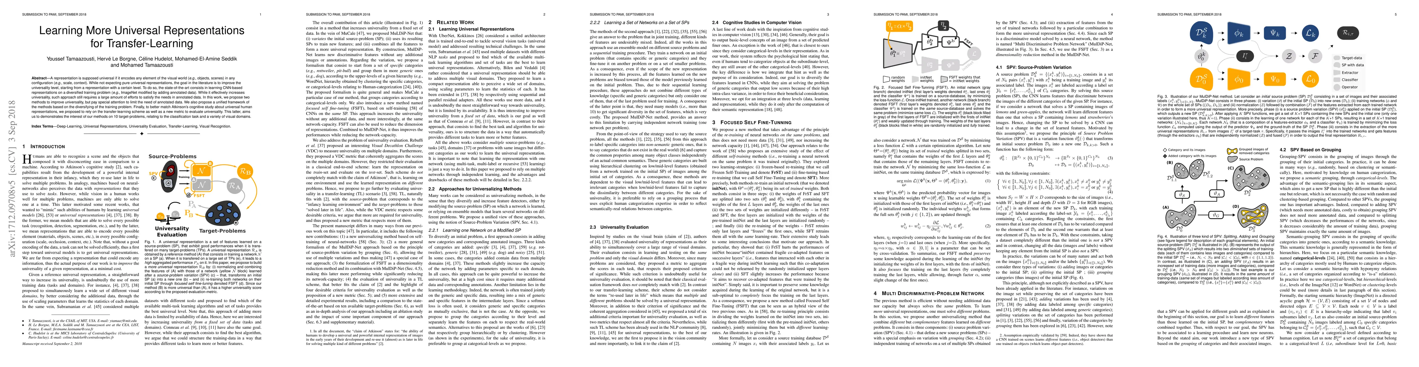 This paper proposes two methods to improve universal representations in transfer-learning for visual domains, aiming to reduce the need for annotated data.