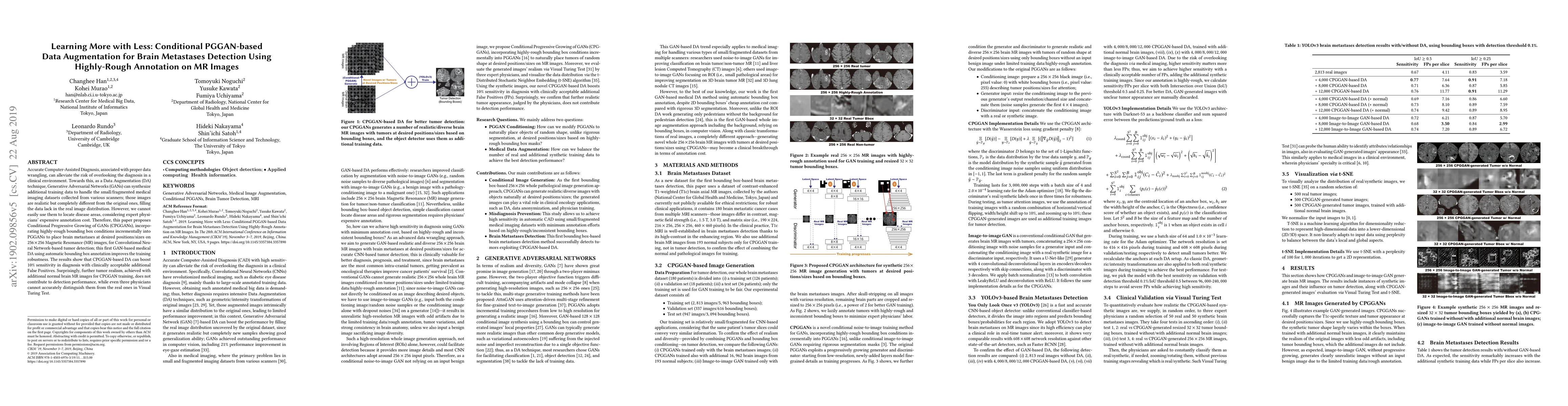 This paper proposes a Conditional Progressive Growing of GANs (CPGGAN) for data augmentation in brain metastases detection using MR images. The method uses highly-rough annotations to generate realistic synthetic images, enhancing training robustness and boosting diagnostic sensitivity by 10%.