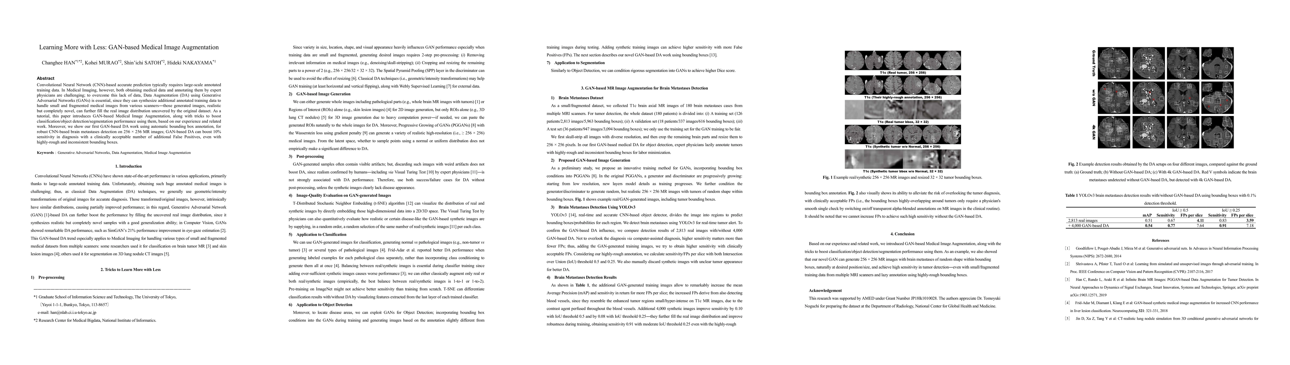Convolutional Neural Network (CNN)-based accurate prediction typically requires large-scale annotated training data. In Medical Imaging, however, both obtaining medical data and annotating them by expert physicians are challenging; to overcome this lack of data, Data Augmentation (DA) using Generative Adversarial Networks (GANs) is essential, since they can synthesize additional annotated training data to handle small and fragmented medical images from various scanners--those generated images, realistic but completely novel, can further fill the real image distribution uncovered by the original dataset. As a tutorial, this paper introduces GAN-based Medical Image Augmentation, along with tricks to boost classification/object detection/segmentation performance using them, based on our experience and related work. Moreover, we show our first GAN-based DA work using automatic bounding box annotation, for robust CNN-based brain metastases detection on 256 x 256 MR images; GAN-based DA can boost 10% sensitivity in diagnosis with a clinically acceptable number of additional False Positives, even with highly-rough and inconsistent bounding boxes.