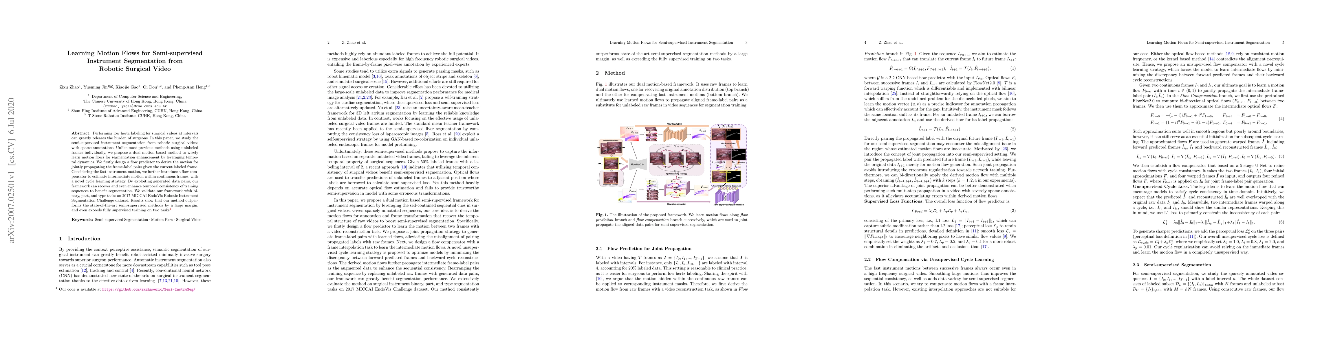 This paper proposes a semi-supervised method for instrument segmentation in robotic surgical videos using sparse annotations, leveraging dual motion flows to enhance temporal consistency and segmentation accuracy. The method outperforms existing semi-supervised techniques and even fully supervised approaches on segmentation tasks.