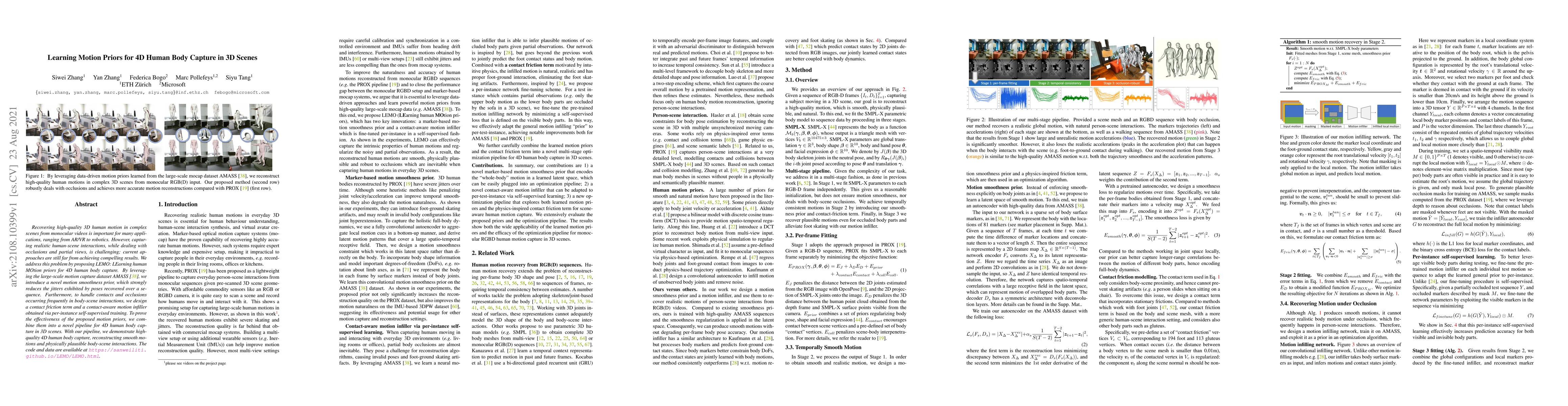 This paper proposes LEMO, a method for capturing high-quality 4D human body motion in 3D scenes from monocular videos, addressing challenges like occlusions and partial views. It leverages motion smoothness priors and contact-aware techniques to achieve realistic human-scene interactions.