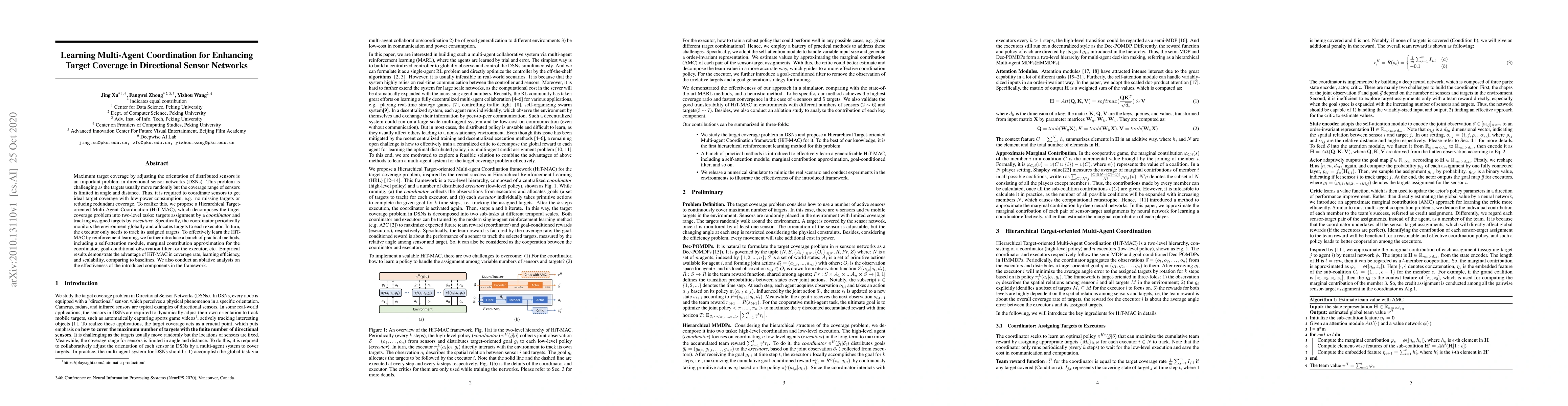 This research proposes Hierarchical Target-oriented Multi-Agent Coordination (HiT-MAC) for optimizing target coverage in directional sensor networks. HiT-MAC divides the task into target allocation by a coordinator and target tracking by executors. It uses reinforcement learning with components like a self-attention module, marginal contribution approximation, and goal-conditional observation filter. Results show HiT-MAC outperforms baselines in coverage, learning efficiency, and scalability.