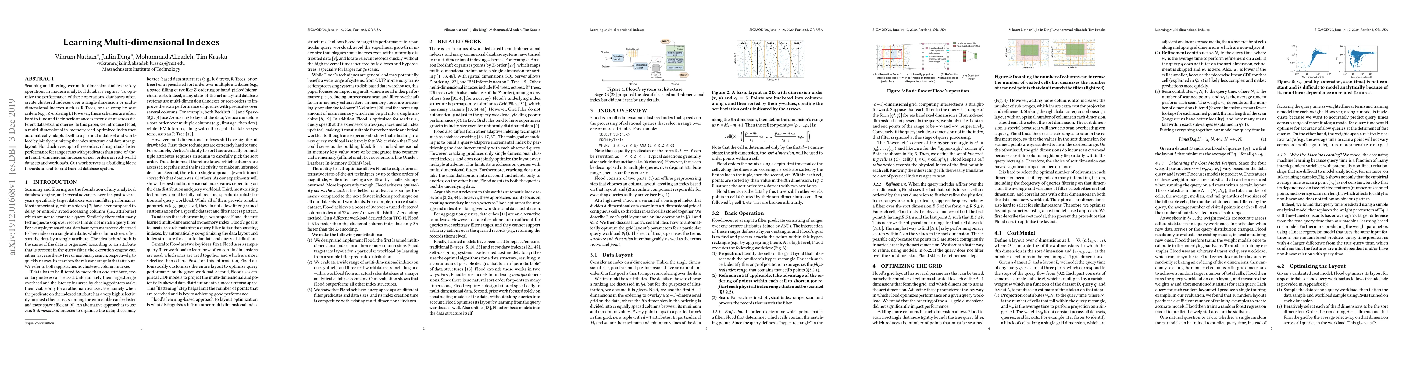 This paper introduces Flood, an adaptive in-memory multi-dimensional index that optimizes both its structure and data storage to enhance performance for range scans, achieving significantly faster results than existing methods on real-world datasets. Flood aims to serve as a foundation for a fully learned database system.