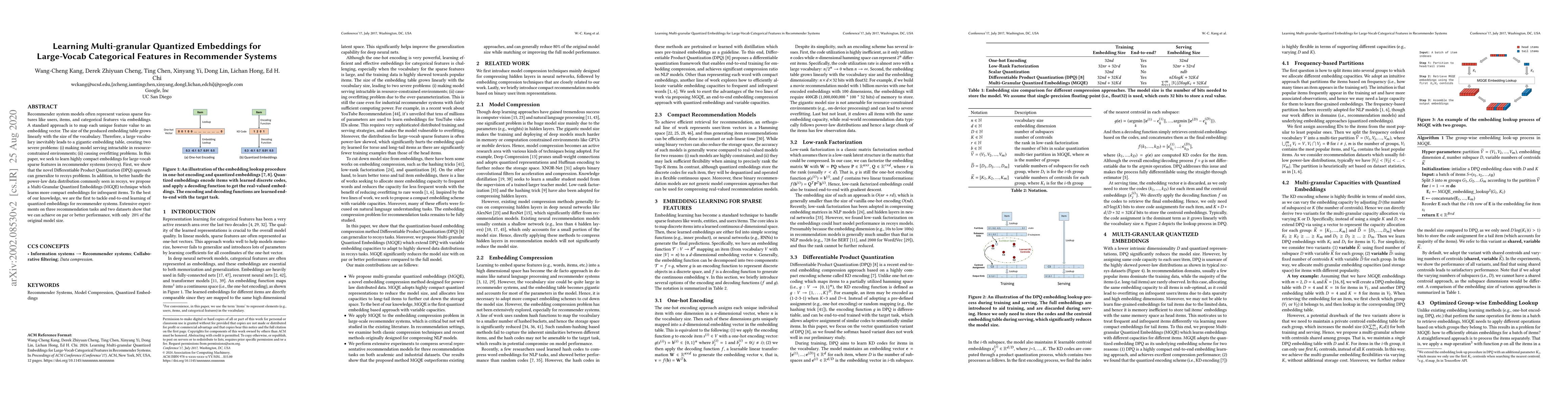 This paper proposes a Differentiable Product Quantization (DPQ) approach and Multi-Granular Quantized Embeddings (MGQE) technique to learn compact embeddings for large-vocabulary categorical features in recommender systems, addressing resource constraints and overfitting issues. Experiments demonstrate competitive performance with significantly reduced model sizes.
