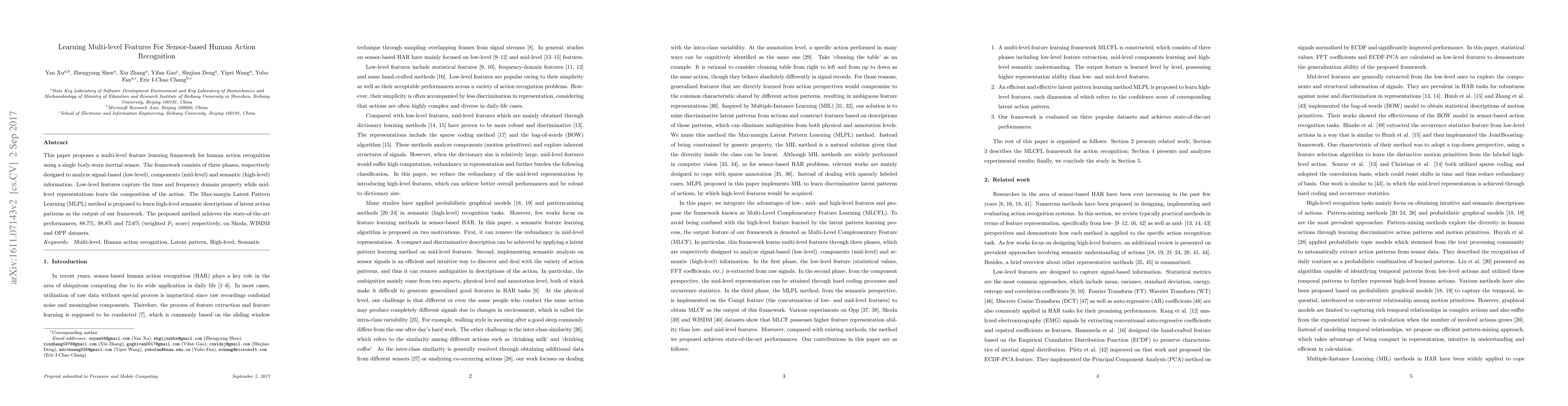 This paper introduces a multi-level feature learning framework for human action recognition using a single inertial sensor, achieving state-of-the-art results on Skoda, WISDM, and OPP datasets by capturing low-level signal properties, mid-level action components, and high-level semantic patterns.