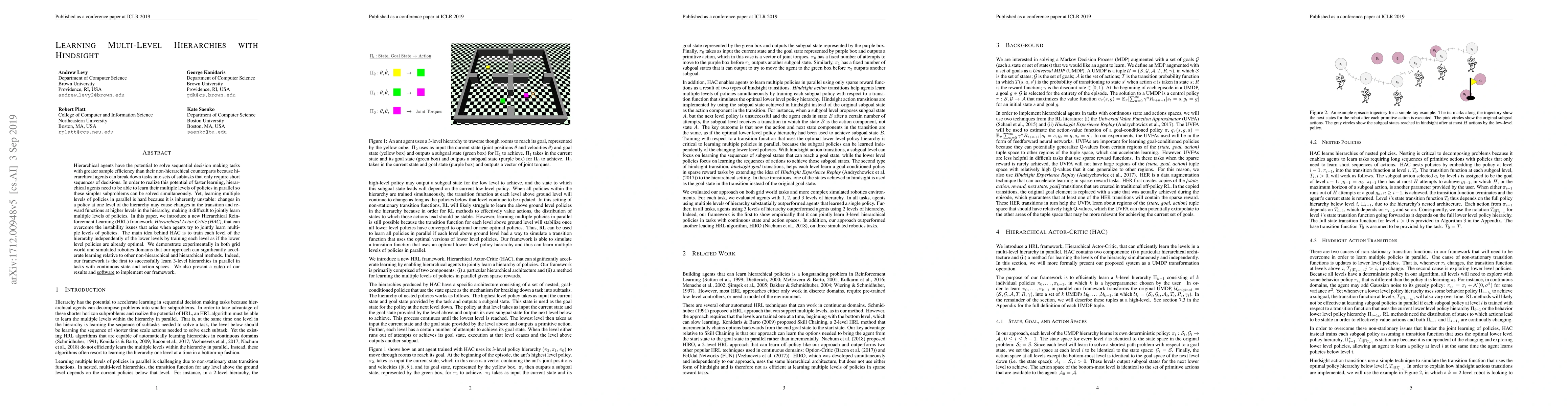 Hierarchical agents have the potential to solve sequential decision making tasks with greater sample efficiency than their non-hierarchical counterparts because hierarchical agents can break down tasks into sets of subtasks that only require short sequences of decisions. In order to realize this potential of faster learning, hierarchical agents need to be able to learn their multiple levels of policies in parallel so these simpler subproblems can be solved simultaneously. Yet, learning multiple levels of policies in parallel is hard because it is inherently unstable: changes in a policy at one level of the hierarchy may cause changes in the transition and reward functions at higher levels in the hierarchy, making it difficult to jointly learn multiple levels of policies. In this paper, we introduce a new Hierarchical Reinforcement Learning (HRL) framework, Hierarchical Actor-Critic (HAC), that can overcome the instability issues that arise when agents try to jointly learn multiple levels of policies. The main idea behind HAC is to train each level of the hierarchy independently of the lower levels by training each level as if the lower level policies are already optimal. We demonstrate experimentally in both grid world and simulated robotics domains that our approach can significantly accelerate learning relative to other non-hierarchical and hierarchical methods. Indeed, our framework is the first to successfully learn 3-level hierarchies in parallel in tasks with continuous state and action spaces.