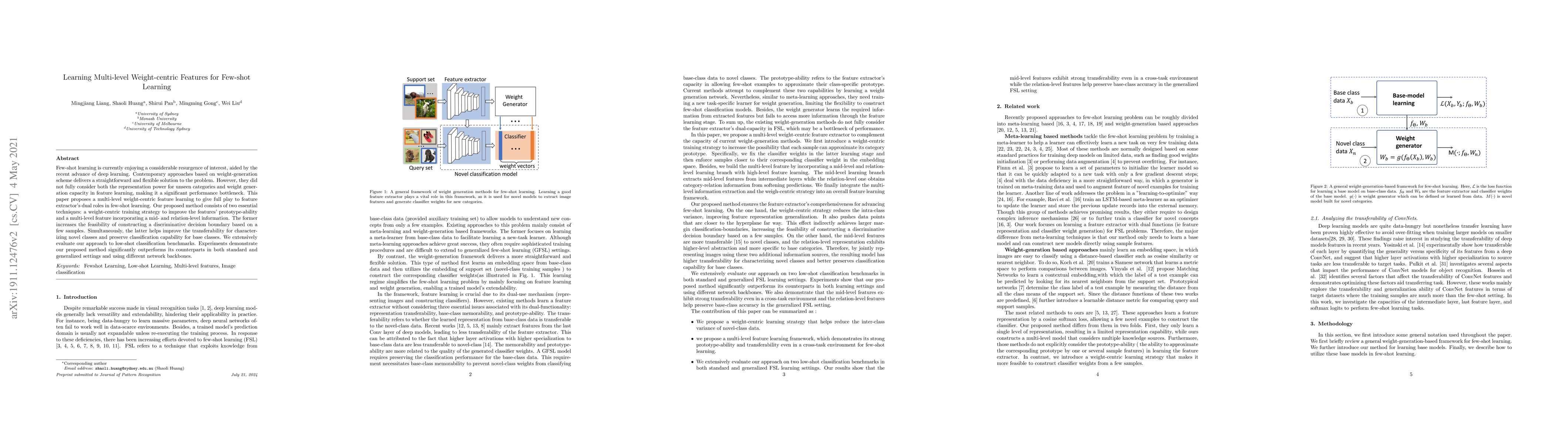 This paper proposes a multi-level weight-centric feature learning method for few-shot learning that enhances both representation power and weight generation capacity. The method combines a weight-centric training strategy with mid- and relation-level feature incorporation to improve feature prototype-ability and transferability, outperforming existing approaches in low-shot classification benchmarks.